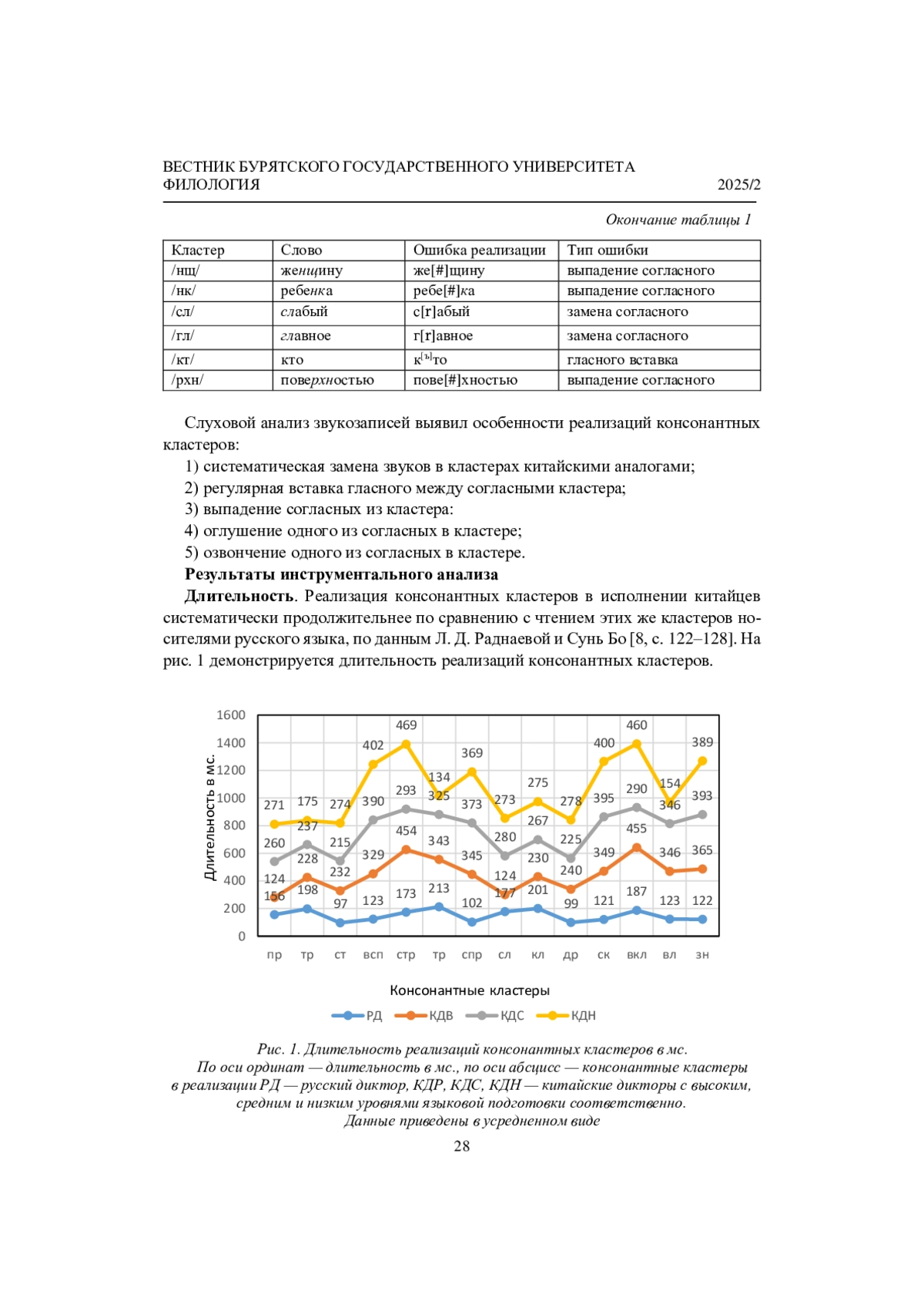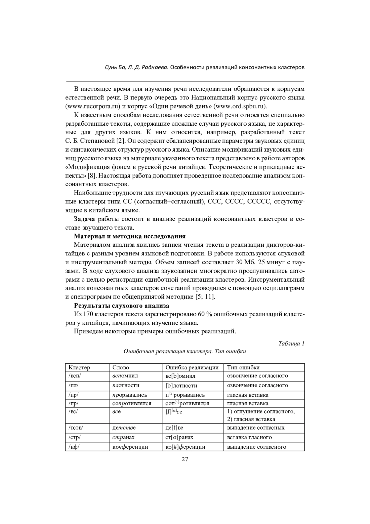В статье анализируются особенности употребления слов с консонантными кластерами в речи информантов-китайцев, изучающих русский язык. Рассматривается 170 консонантных кластеров в составе текста. В речи китайцев наблюдается замена звуков в сочетаниях согласных, выпадение согласных, гласные вставки, появление дополнительных слогов, изменяющих ритмическую структуру русского слова, а также преобладание полного типа произнесения кластеров. Полученные данные могут быть использованы для совершенствования автоматических систем распознавания речи и в практике преподавания русского языка как иностранного. Результаты исследования, проведенного на основе анализа записей русского текста в китайском произнесении, выявили особенности реализаций консонантных кластеров.