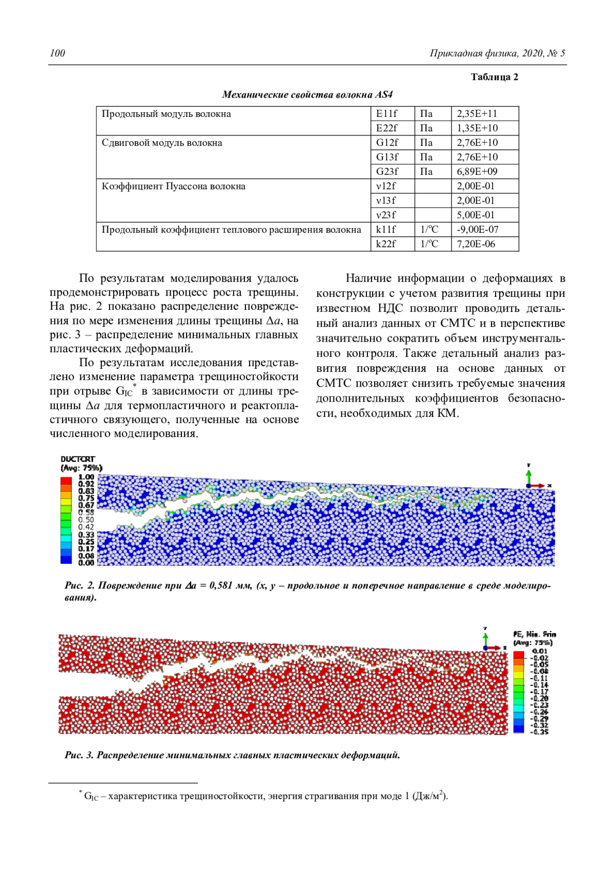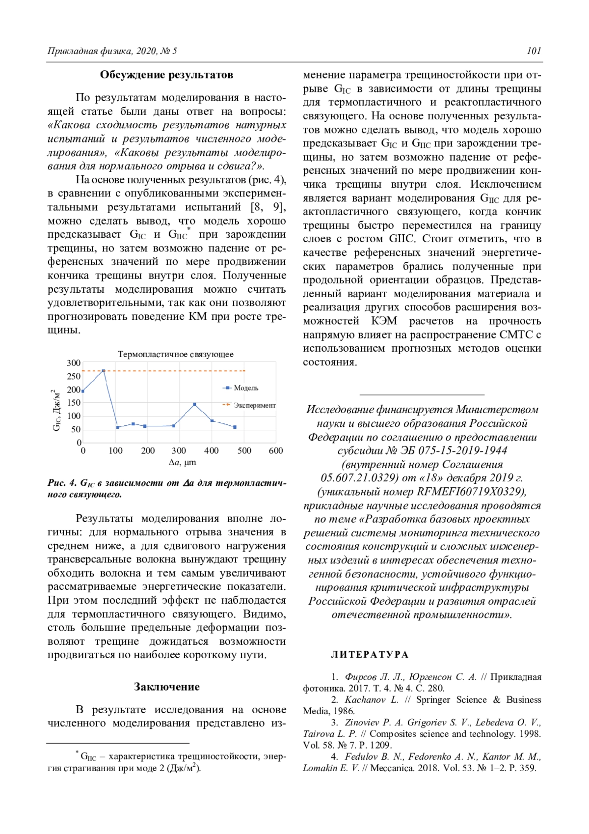 численного моделирования представлено из- * GIIC – характеристика трещиностойкости, энергия страгивания при моде 2 (Дж/м2). менение параметра трещиностойкости при отрыве GIC в зависимости от длины трещины для термопластичного и реактопластичного связующего. На основе полученных результатов можно сделать вывод, что модель хорошо предсказывает GIC и GIIC при зарождении трещины, но затем возможно падение от референсных значений по мере продвижении кончика трещины внутри слоя. Исключением является вариант моделирования GIIC для реактопластичного связующего, когда кончик трещины быстро переместился на границу слоев с ростом GIIC. Стоит отметить, что в качестве референсных значений энергетических параметров брались полученные при продольной ориентации образцов. Представленный вариант моделирования материала и реализация других способов расширения возможностей КЭМ расчетов на прочность напрямую влияет на распространение СМТС с использованием прогнозных методов оценки состояния.