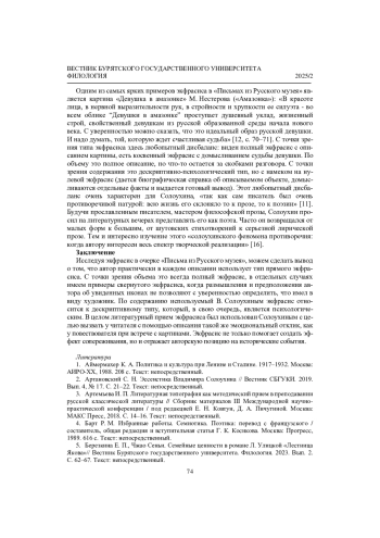 7. Карташова Е. П. Афористичность авторского сознания в жанре “лирико-философской миниатюры” (В. В. Розанов и В. А. Солоухин) // Вестник Марийского государственного университета. 2024. Вып. 18, № 3. С. 388-393. Текст: непосредственный. EDN: JQDNZA