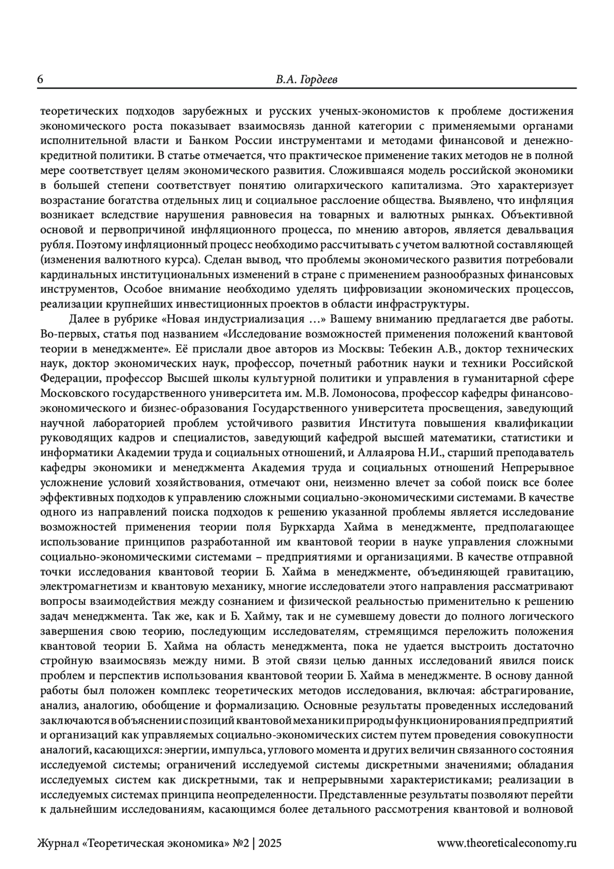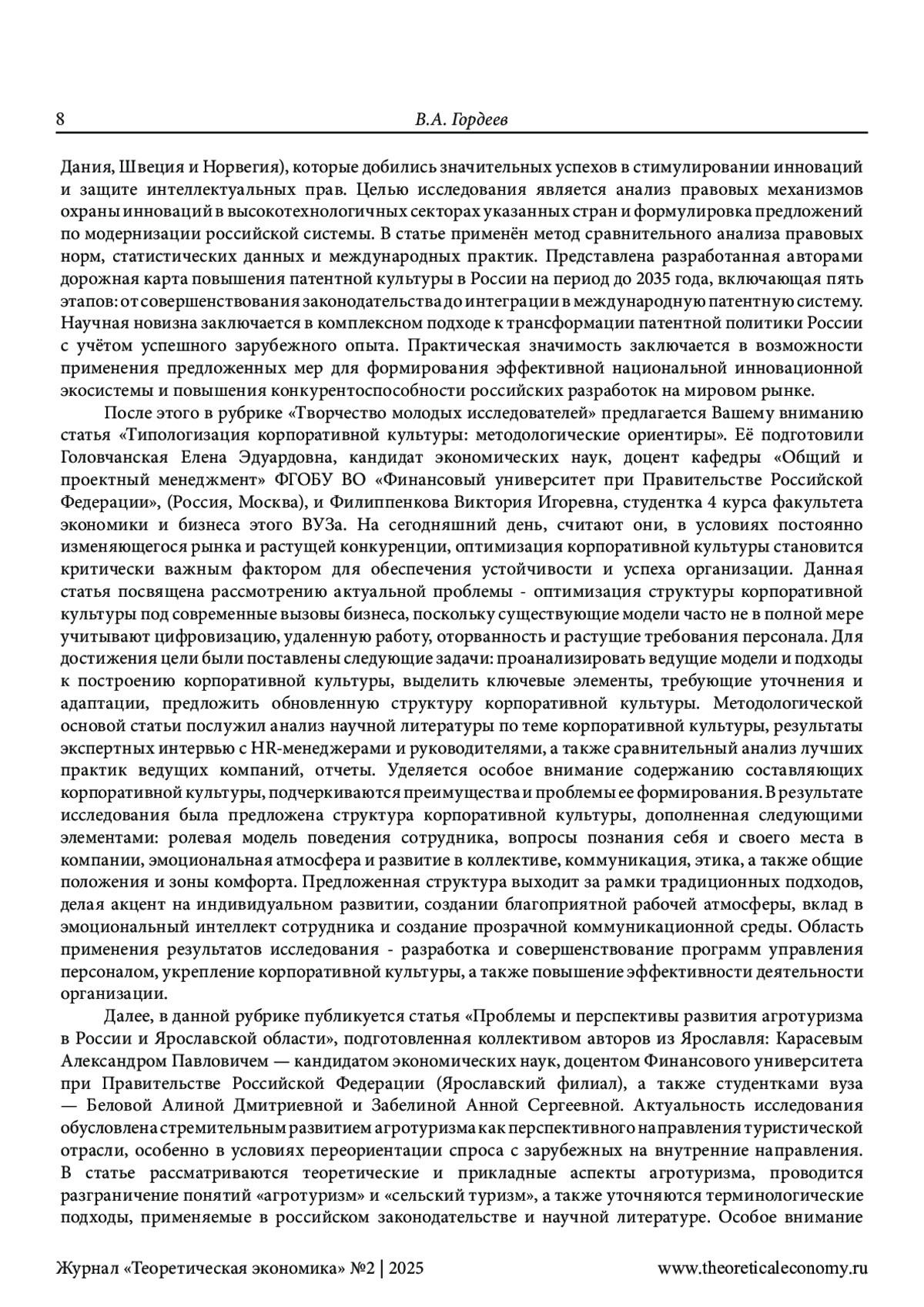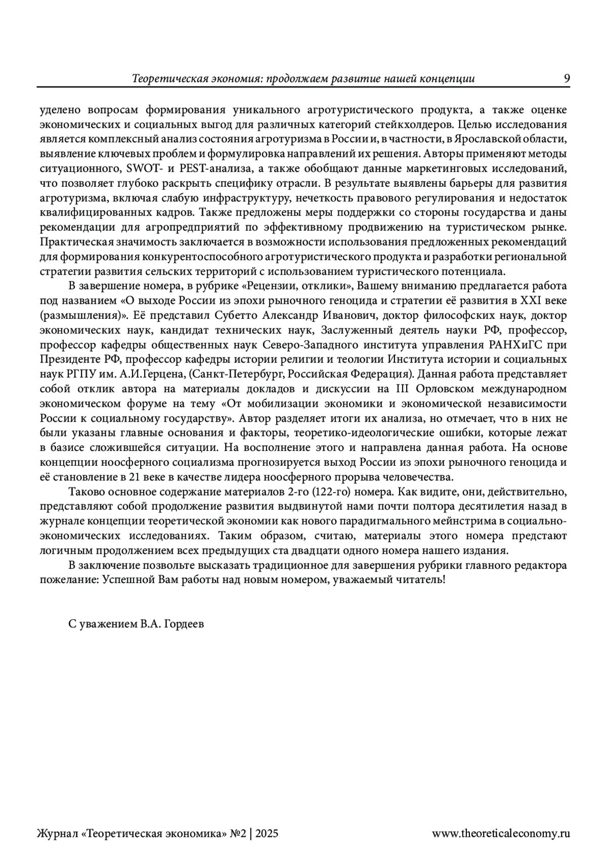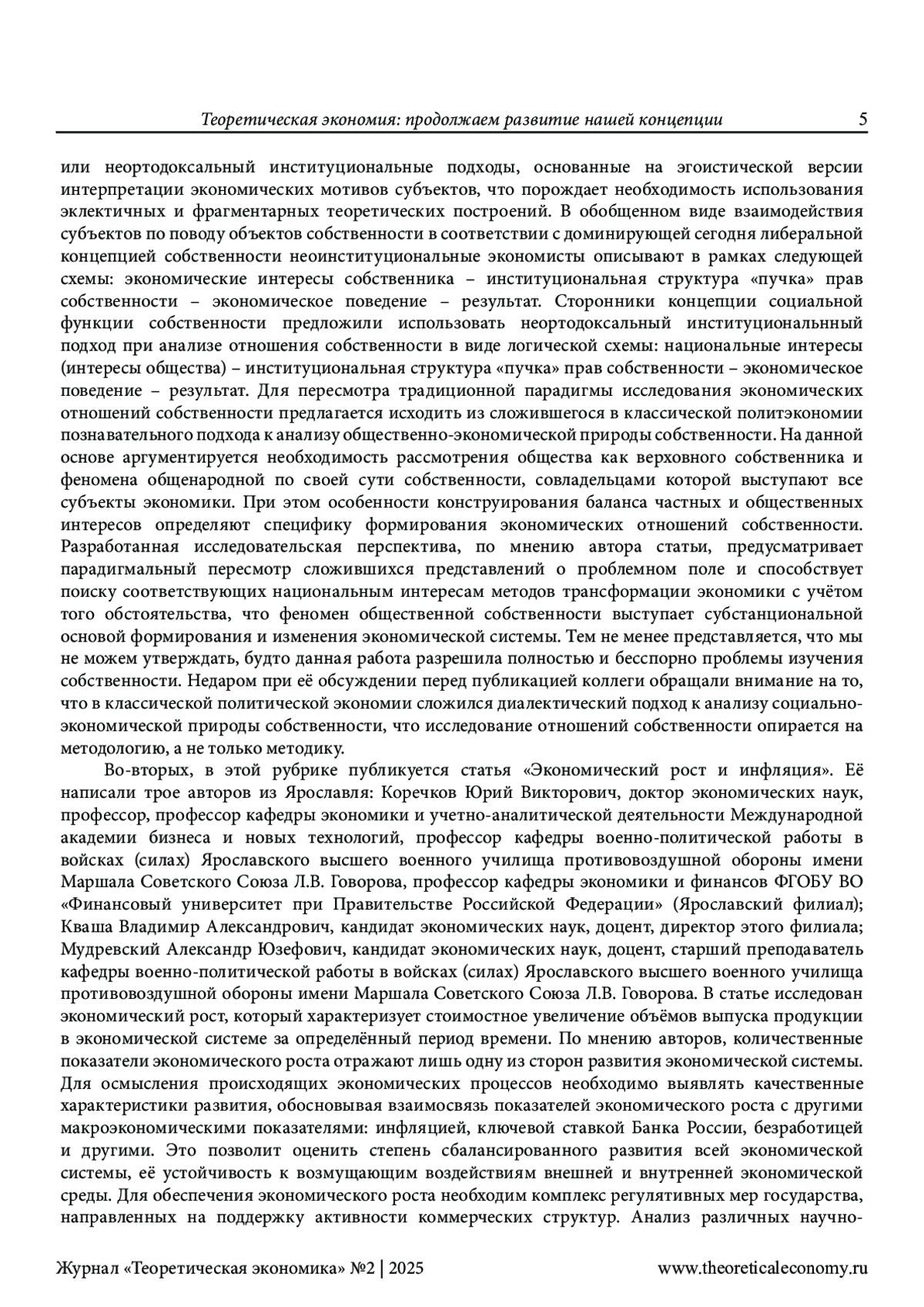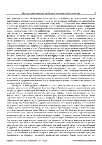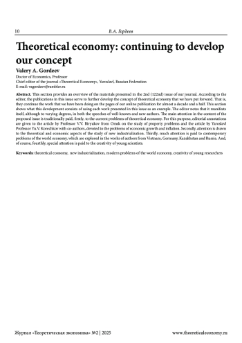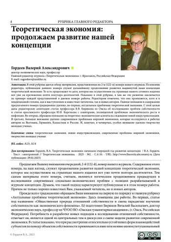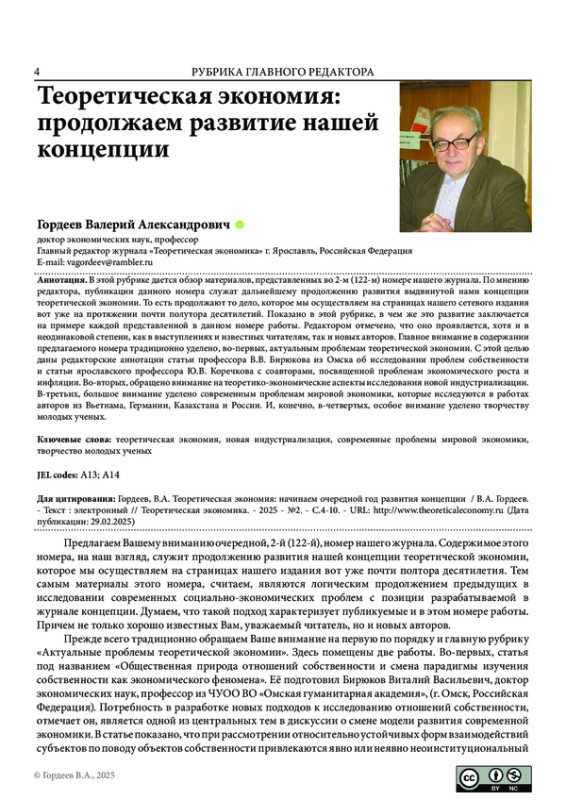 В этой рубрике дается обзор материалов, представленных во 2-м (122-м) номере нашего журнала. По мнению редактора, публикации данного номера служат дальнейшему продолжению развития выдвинутой нами концепции теоретической экономии. То есть продолжают то дело, которое мы осуществляем на страницах нашего сетевого издания вот уже на протяжении почти полутора десятилетий. Показано в этой рубрике, в чем же это развитие заключается на примере каждой представленной в данном номере работы. Редактором отмечено, что оно проявляется, хотя и в неодинаковой степени, как в выступлениях и известных читателям, так и новых авторов. Главное внимание в содержании предлагаемого номера традиционно уделено, во-первых, актуальным проблемам теоретической экономии. С этой целью даны редакторские аннотации статьи профессора В. В. Бирюкова из Омска об исследовании проблем собственности и статьи ярославского профессора Ю. В. Коречкова с соавторами, посвященной проблемам экономического роста и инфляции. Во-вторых, обращено внимание на теоретико-экономические аспекты исследования новой индустриализации. В-третьих, большое внимание уделено современным проблемам мировой экономики, которые исследуются в работах авторов из Вьетнама, Германии, Казахстана и России. И, конечно, в-четвертых, особое внимание уделено творчеству молодых ученых.