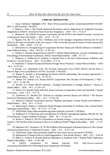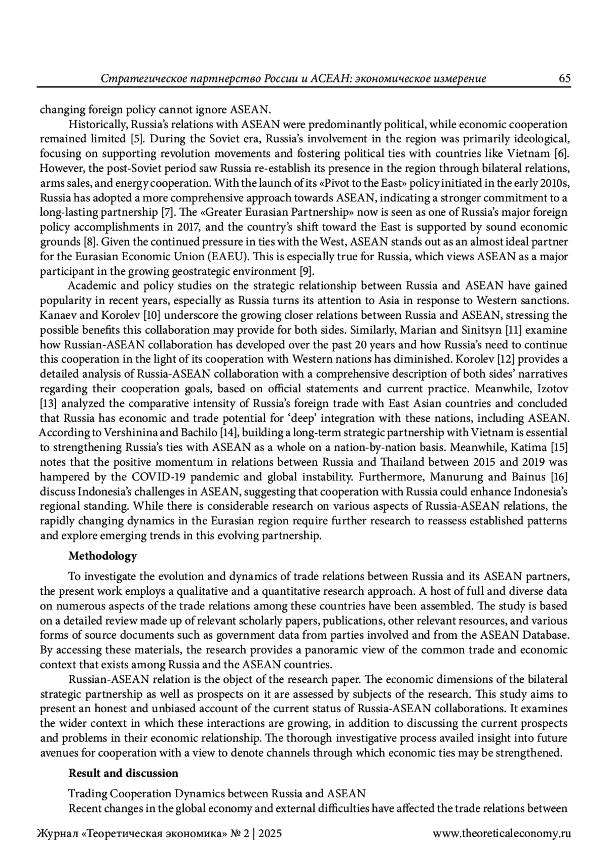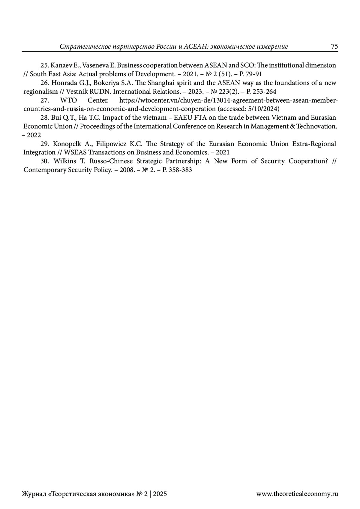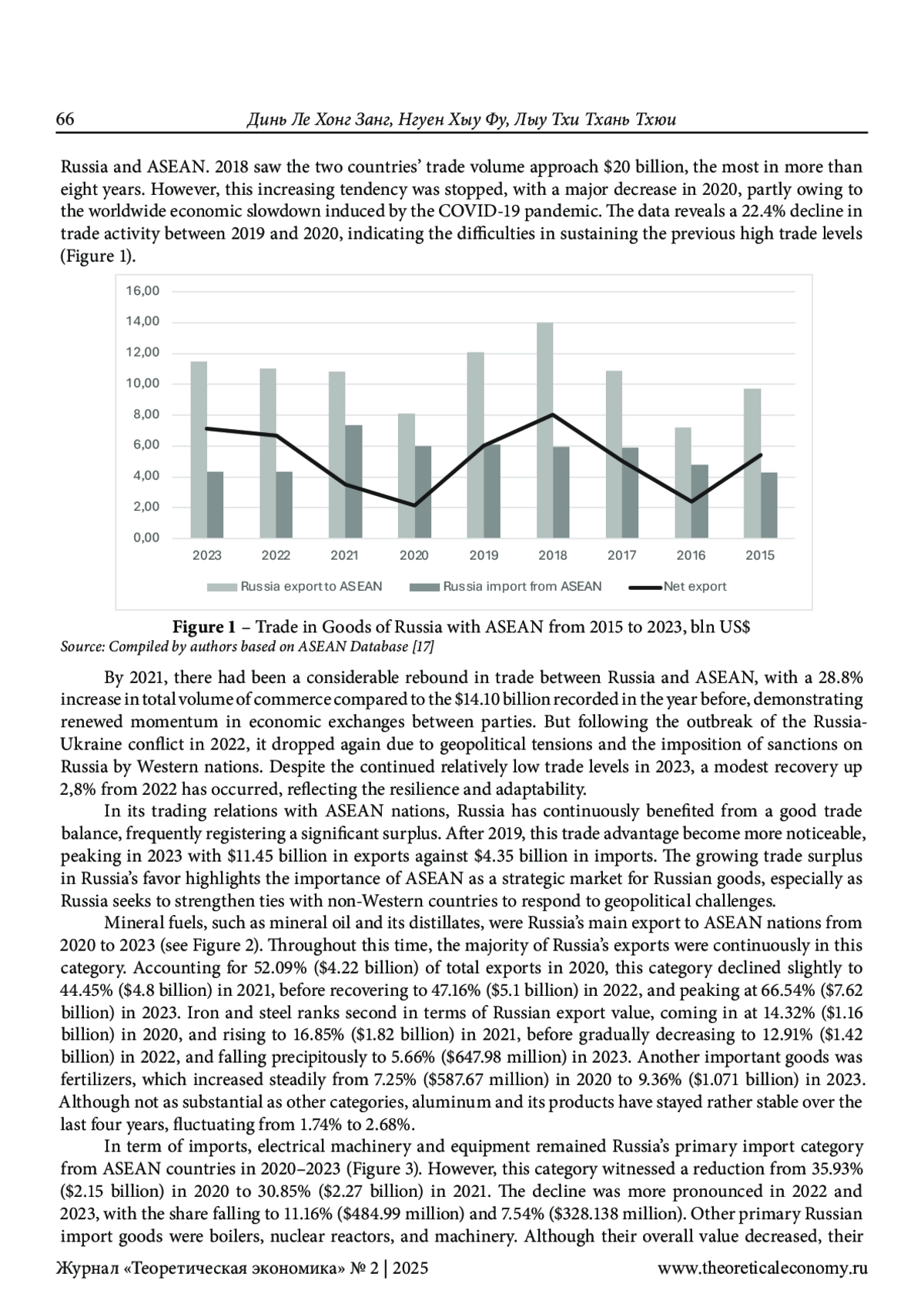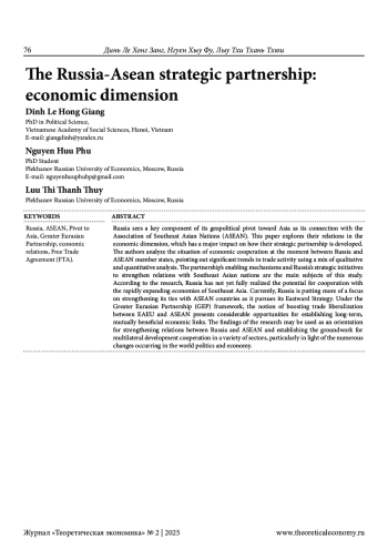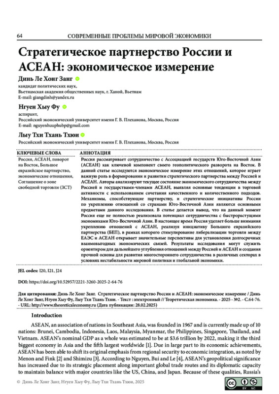 ЛЫУ Т. Т., НГУЕН Х. Ф., ДИНЬ Л. Х. СТРАТЕГИЧЕСКОЕ ПАРТНЕРСТВО РОССИИ И АСЕАН: ЭКОНОМИЧЕСКОЕ ИЗМЕРЕНИЕ // ТЕОРЕТИЧЕСКАЯ ЭКОНОМИКА. 2025. № 2 (122)
