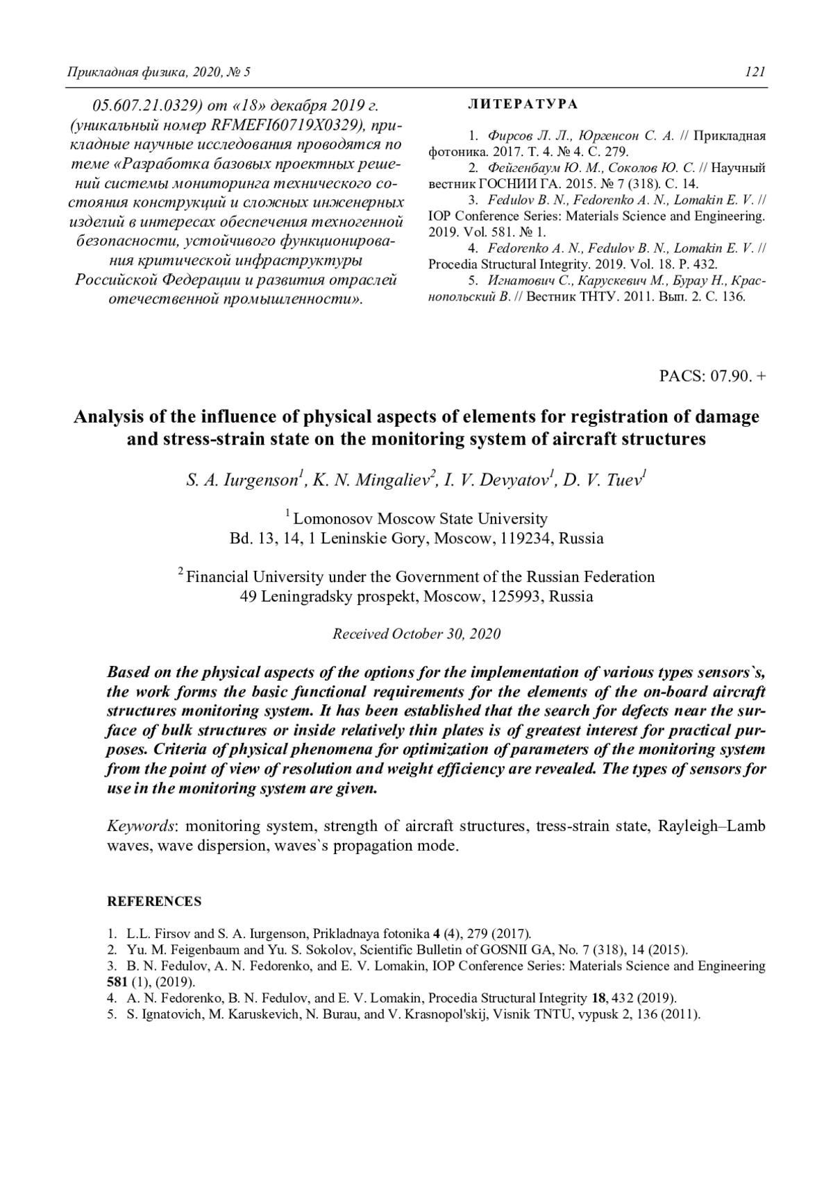 Юргенсон С. А., Мингалиев К. Н., Девятов И. В., Туев Д. В. Анализ влияния физических аспектов элементов регистрации повреждений и напряженно-деформированного состояния на систему мониторинга авиационных конструкций 116