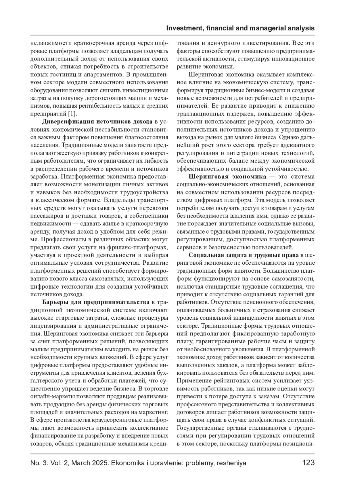 Шеринговая экономика (SE) представляет собой модель, основанную на совместном использовании ресурсов через цифровые платформы. Ее развитие способствует снижению транзакционных издержек, оптимизации использования активов и расширению возможностей для самозанятости. Однако наряду с экономическими выгодами SE порождает социальные вызовы, включая отсутствие трудовых гарантий, правовые коллизии и риски цифрового неравенства. В статье анализируются ключевые преимущества и проблемы шеринговой экономики, а также перспективы ее дальнейшего роста в контексте технологических и регуляторных изменений.