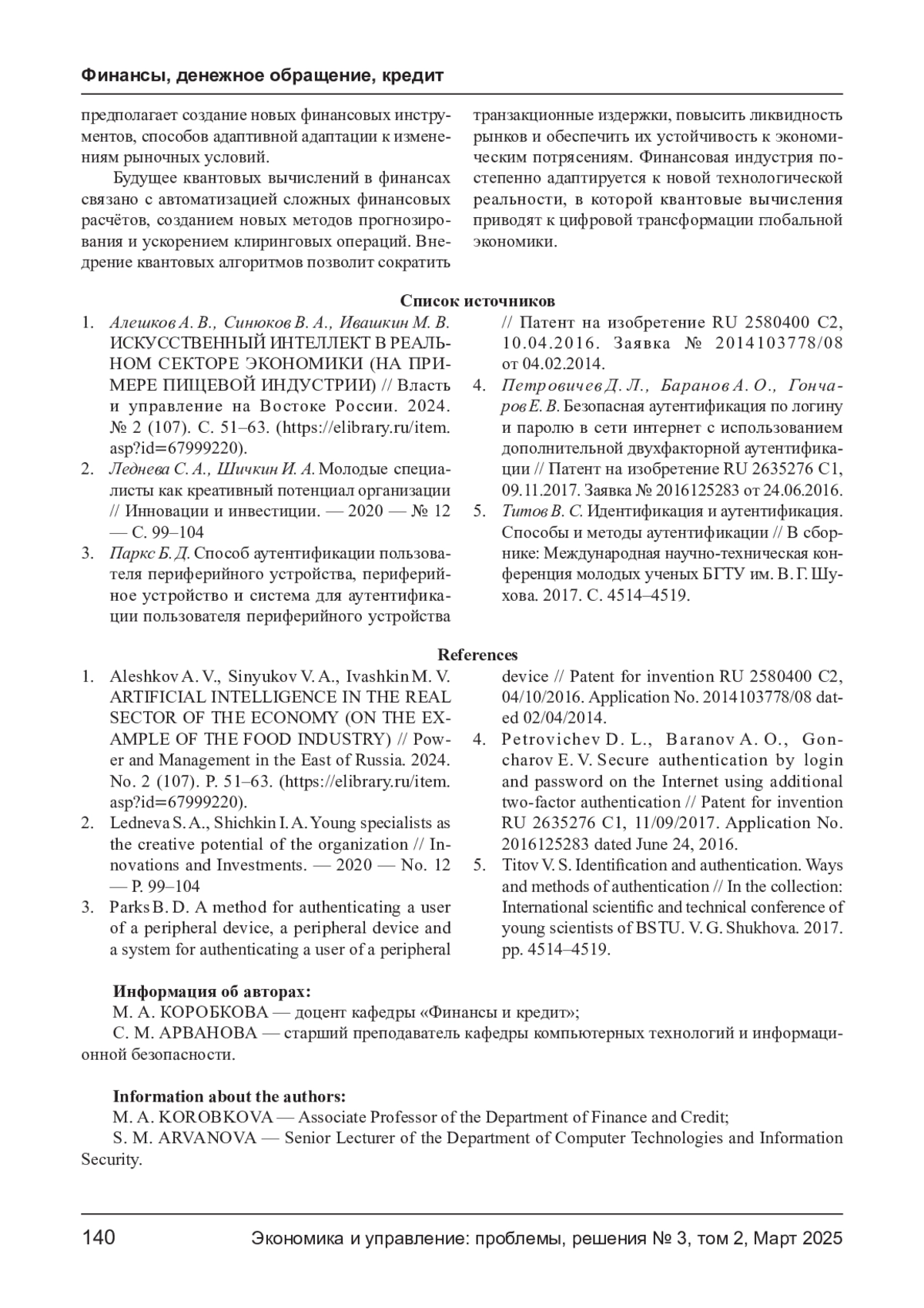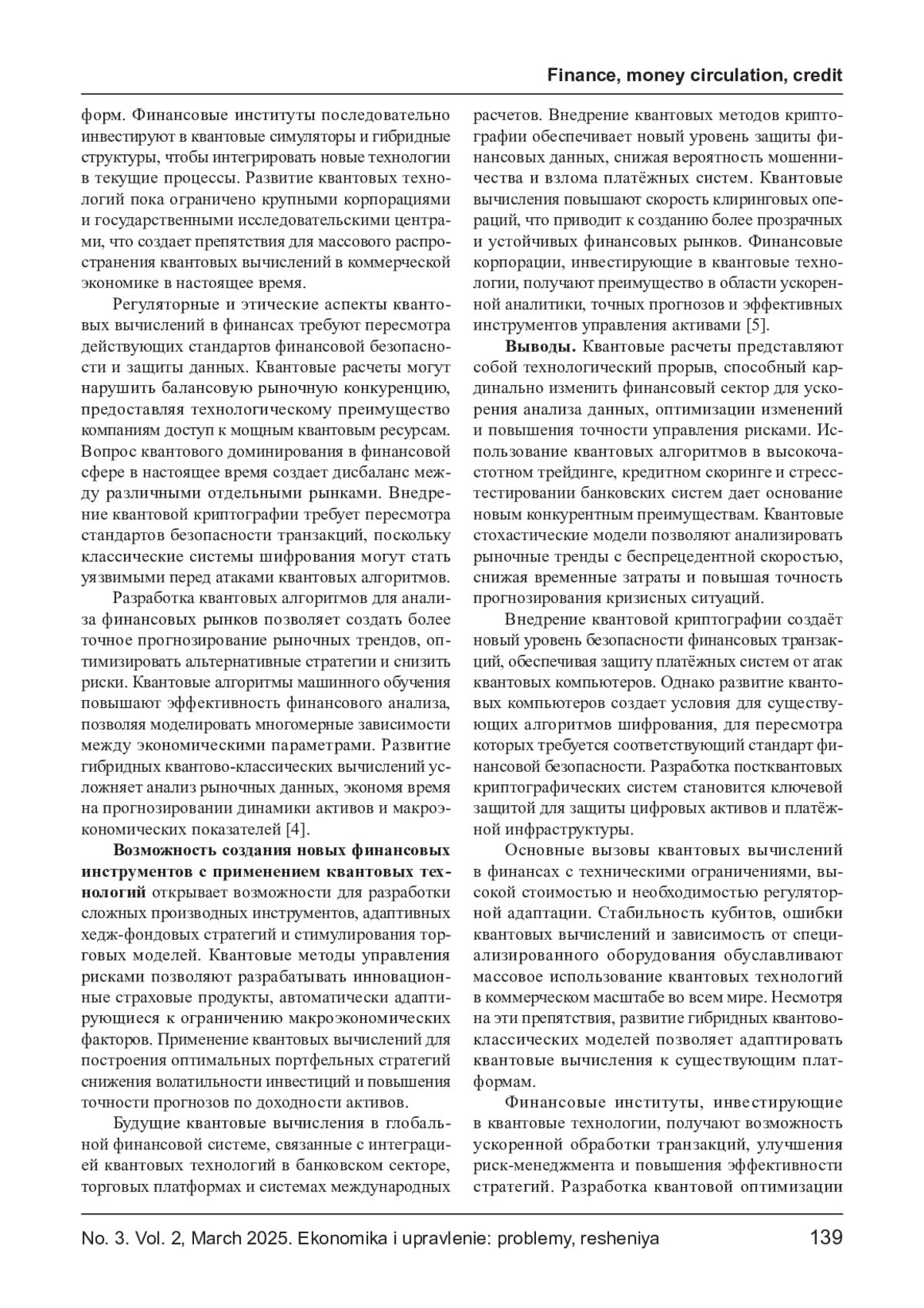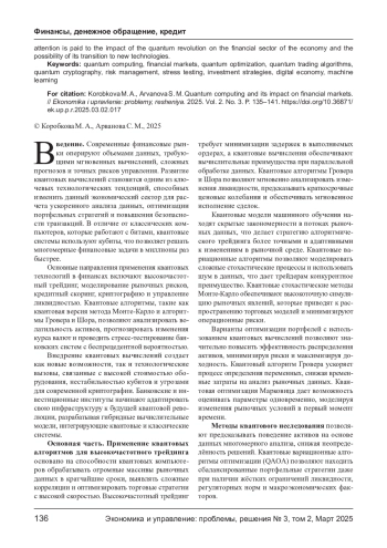 КОРОБКОВА М. А., АРВАНОВА С. М. КВАНТОВЫЕ ВЫЧИСЛЕНИЯ И ИХ ВЛИЯНИЕ НА ФИНАНСОВЫЕ РЫНКИ // ЭКОНОМИКА И УПРАВЛЕНИЕ: ПРОБЛЕМЫ, РЕШЕНИЯ. 2025. ТОМ 2 № 3