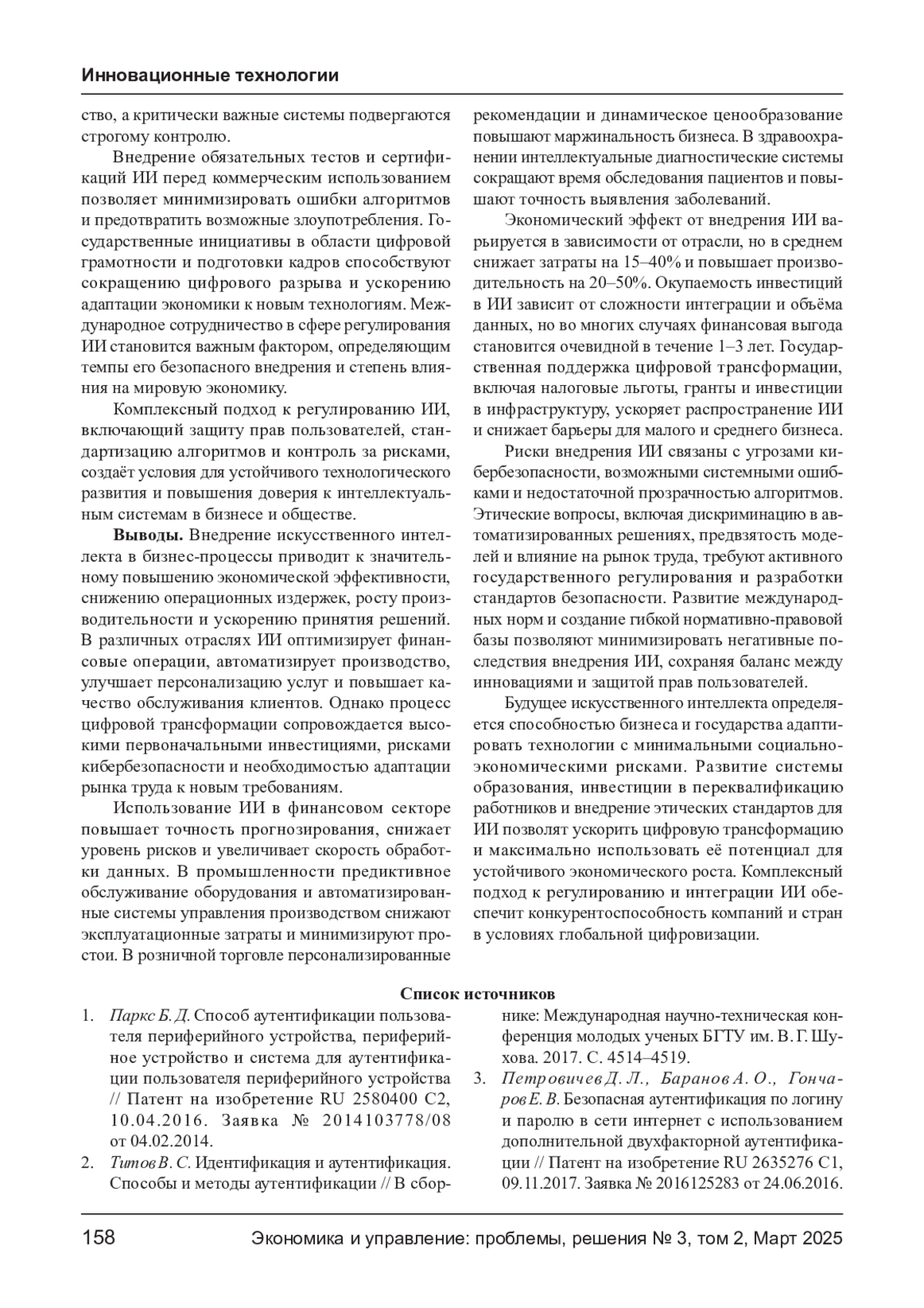 Внедрение искусственного интеллекта (ИИ) в бизнес- процессы становится ключевым фактором повышения экономической эффективности, снижая операционные издержки, увеличивая производительность и оптимизируя принятие управленческих решений. Автоматизация позволяет предприятиям ускорять обработку данных, персонализировать взаимодействие с клиентами и прогнозировать рыночные тренды, что обеспечивает конкурентные преимущества. Однако процесс интеграции ИИ сопряжён с финансовыми затратами, рисками кибербезопасности и изменениями на рынке труда. В статье рассматриваются экономические выгоды внедрения ИИ в различных секторах, включая финансы, промышленность, торговлю и здравоохранение, анализируются инвестиционные аспекты цифровой трансформации, а также исследуются потенциальные риски и регуляторные вызовы. Оценивается влияние ИИ на рынок труда, роль государственных инициатив в поддержке инноваций и перспективы формирования новой экономической модели на основе интеллектуальных технологий.