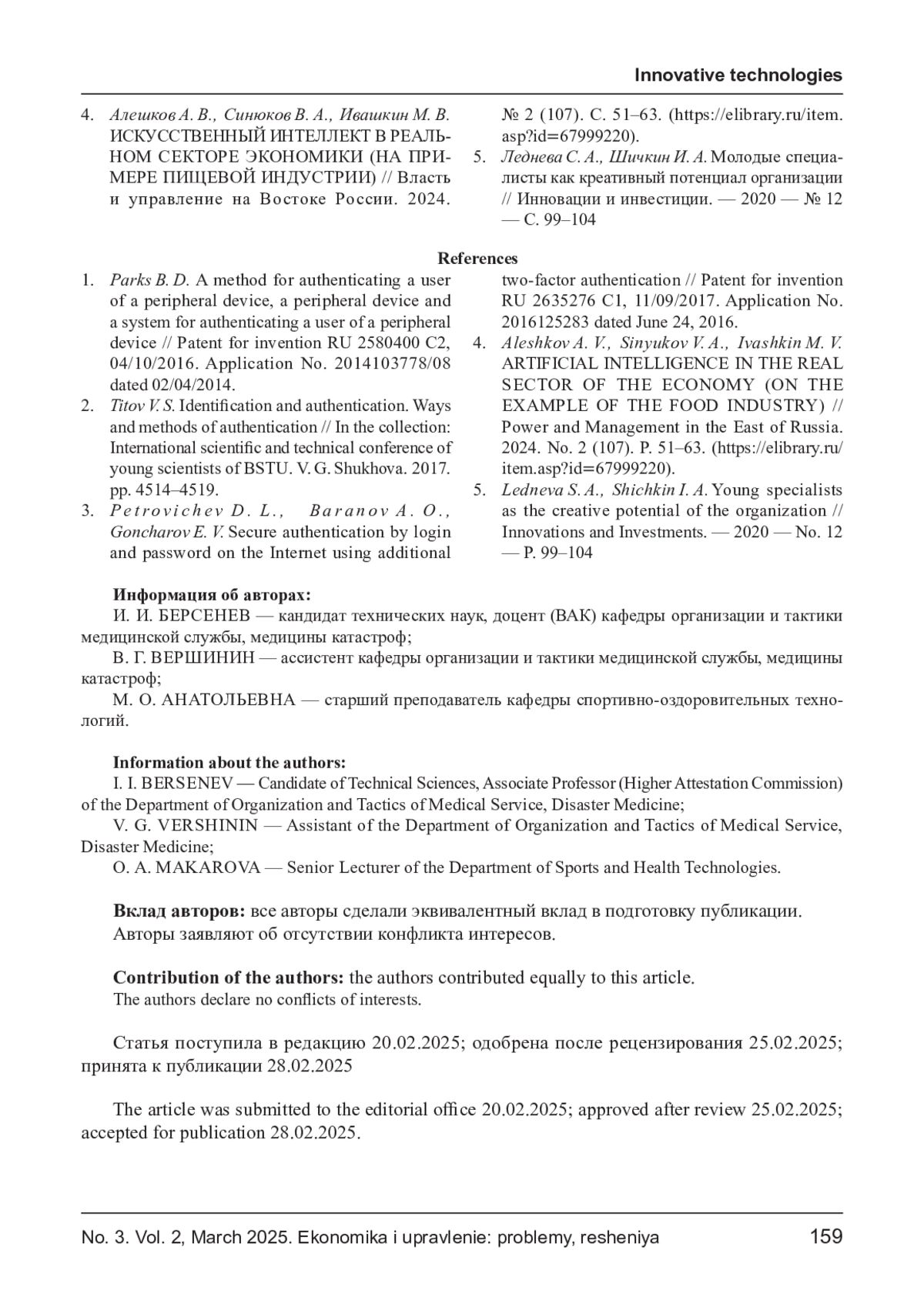 2. Титов В. С. Идентификация и аутентификация. Способы и методы аутентификации // В сборнике: Международная научно-техническая конференция молодых ученых БГТУ им. В. Г. Шухова. 2017. С. 4514-4519. EDN: XQQHDF