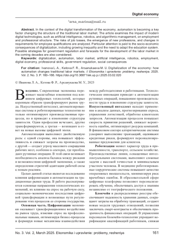В условиях цифровой трансформации экономики автоматизация становится ключевым фактором, изменяющим структуру традиционного рынка труда. В статье рассматривается влияние современных цифровых технологий, таких как искусственный интеллект, роботизация и алгоритмическое управление, на занятость и профессиональную структуру. Анализируются риски потери рабочих мест, появление новых профессий и изменение требований к квалификации работников. Особое внимание уделяется социально- экономическим последствиям цифровизации, включая рост неравенства и необходимость адаптации системы образования. Также рассматриваются возможные стратегии государственного регулирования и прогнозы развития рынка труда в ближайшие десятилетия.