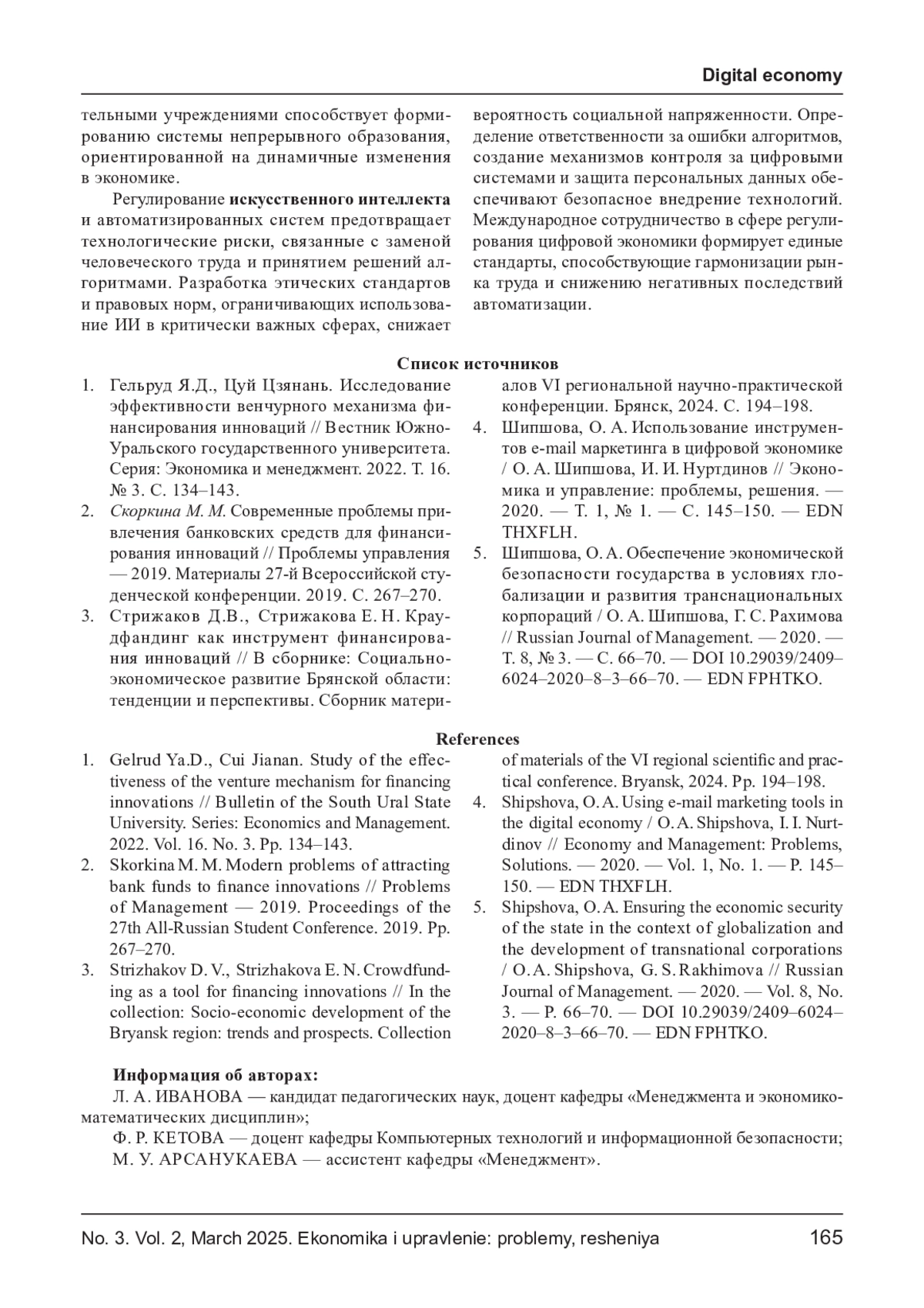 5. Шипшова, О. А. Обеспечение экономической безопасности государства в условиях глобализации и развития транснациональных корпораций / О. А. Шипшова, Г. С. Рахимова// Russian Journal of Management. - 2020. -Т. 8, № 3. - С. 66-70. DOI: 10.29039/2409-6024-2020-8-3-66-70 EDN: FPHTKO
