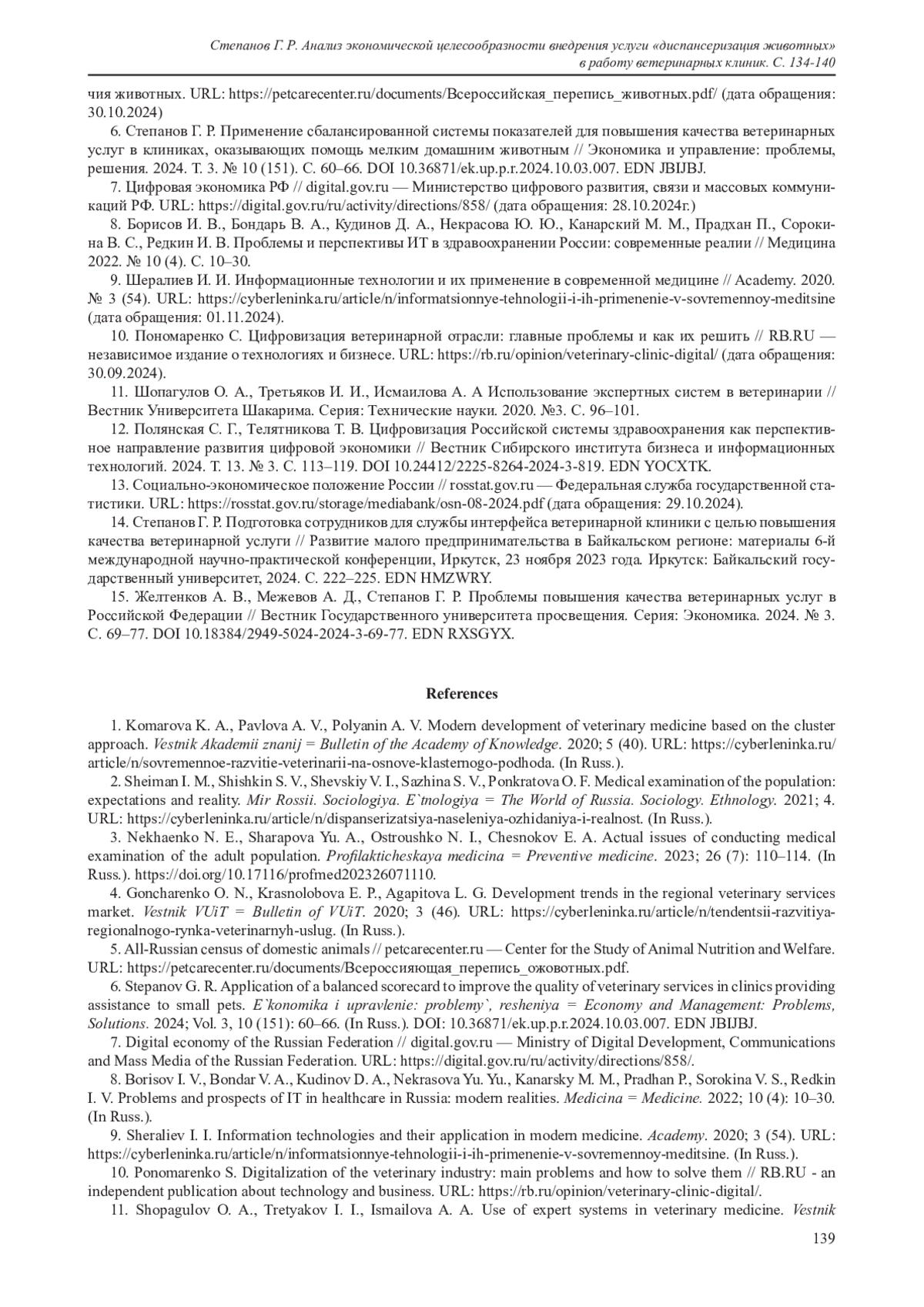 15. Желтенков А. В., Межевов А. Д., Степанов Г. Р. Проблемы повышения качества ветеринарных услуг в Российской Федерации // Вестник Государственного университета просвещения. Серия: Экономика. 2024. № 3. С. 69-77. https://doi.org/10.18384/2949-5024-2024-3-69-77. EDN RXSGYX.