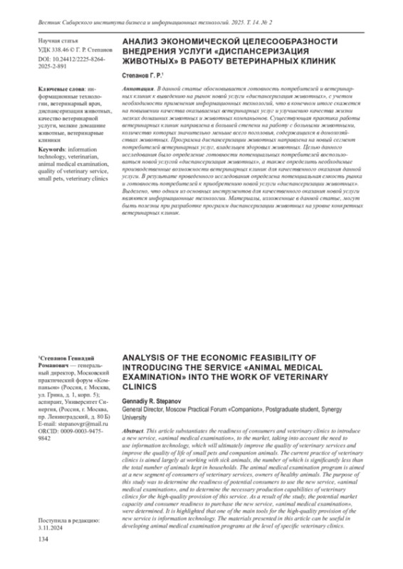 В данной статье обосновывается готовность потребителей и ветеринарных клиник к выведению на рынок новой услуги «диспансеризация животных», с учетом необходимости применения информационных технологий, что в конечном итоге скажется на повышении качества оказываемых ветеринарных услуг и улучшению качества жизни мелких домашних животных и животных компаньонов. Существующая практика работы ветеринарных клиник направлена в большей степени на работу с больными животными, количество которых значительно меньше всего поголовья, содержащихся в домохозяйствах животных. Программа диспансеризации животных направлена на новый сегмент потребителей ветеринарных услуг, владельцев здоровых животных. Целью данного исследования было определение готовности потенциальных потребителей воспользоваться новой услугой «диспансеризация животных», а также определить необходимые производственные возможности ветеринарных клиник для качественного оказания данной услуги. В результате проведенного исследования определена потенциальная емкость рынка и готовность потребителей к приобретению новой услуги «диспансеризации животных». Выделено, что одним из основных инструментов для качественного оказания новой услуги являются информационные технологии. Материалы, изложенные в данной статье, могут быть полезны при разработке программ диспансеризации животных на уровне конкретных ветеринарных клиник.