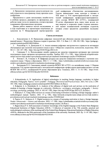1. Колесниченко А. Н. Применение цифровых технологий при обучении лексике иностранного языка в высшей школе // Педагогика. Вопросы теории и практики. 2021. Т. 6. Вып. 2. С. 298-303. URL: https://pedagogy-journal.ru/article/ped20210023/fulltext.
