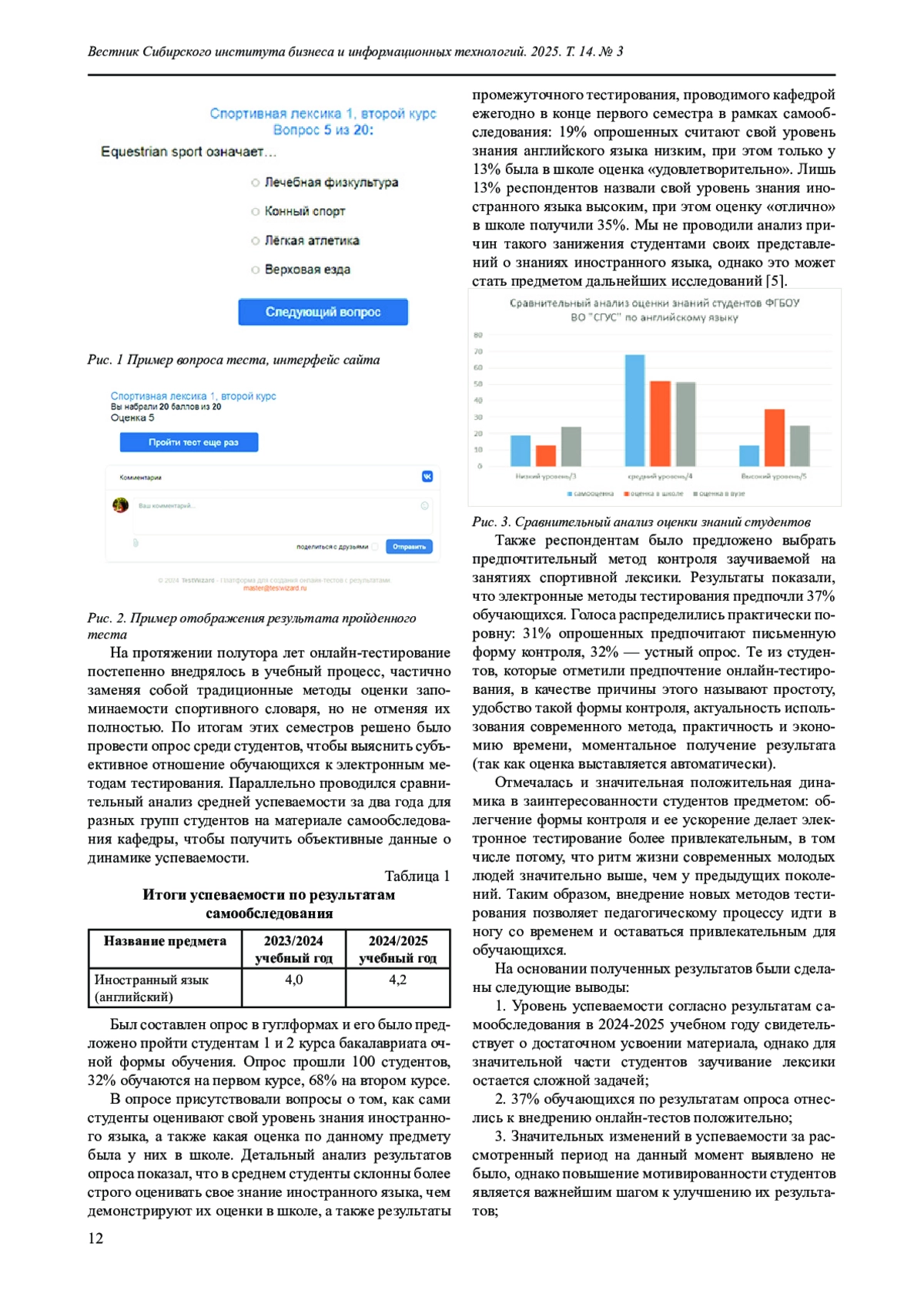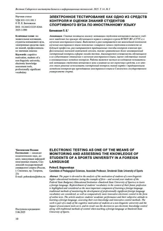 Статья посвящена анализу мотивации студентов неязыкового высшего учебного заведения (на примере обучающихся первого и второго курсов ФГБОУ ВО «СГУС») к изучению иностранного языка. Выделяется и рассматривается как важнейший компонент изучения иностранного языка пополнение словарного запаса студентов в контексте их будущей профессии, рассматриваются традиционные способы контроля освоения профессионально значимой иноязычной лексики, также сравнительно более инновационный электронный контроль в форме онлайн тестов. Анализируется успеваемость обучающихся и их субъективное отношение к изучению иностранного языка, оценке собственных знаний и инновационным методам контроля. Работа является частью исследования познавательной мотивации студентов неязыкового вуза и влияния на нее оценочных средств, и ее итогом стало решение использовать электронный контроль знаний наряду с традиционными методами контроля при преподавании иностранного языка в Смоленском государственном университете спорта.