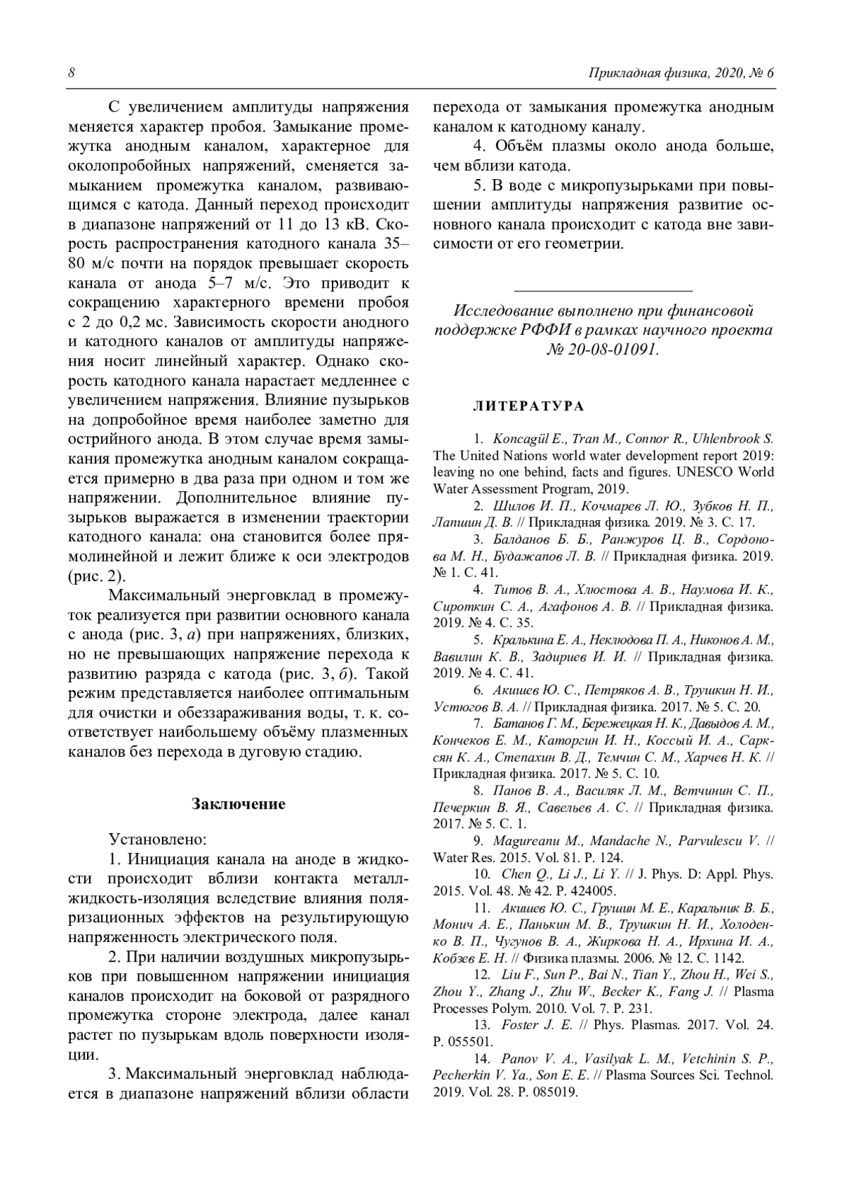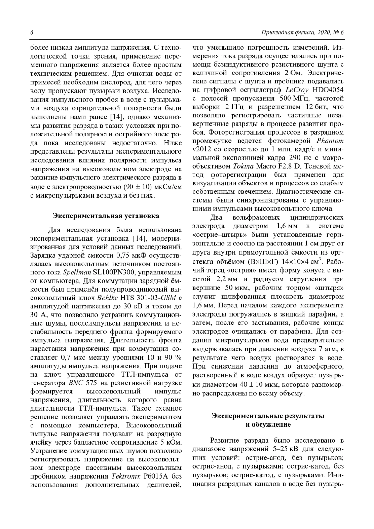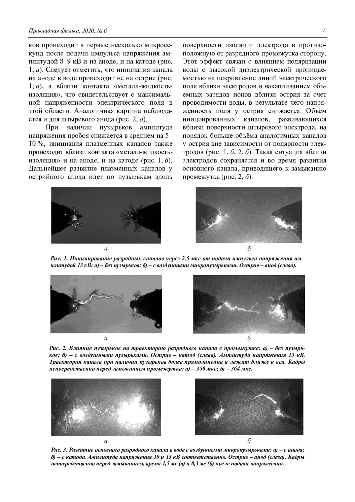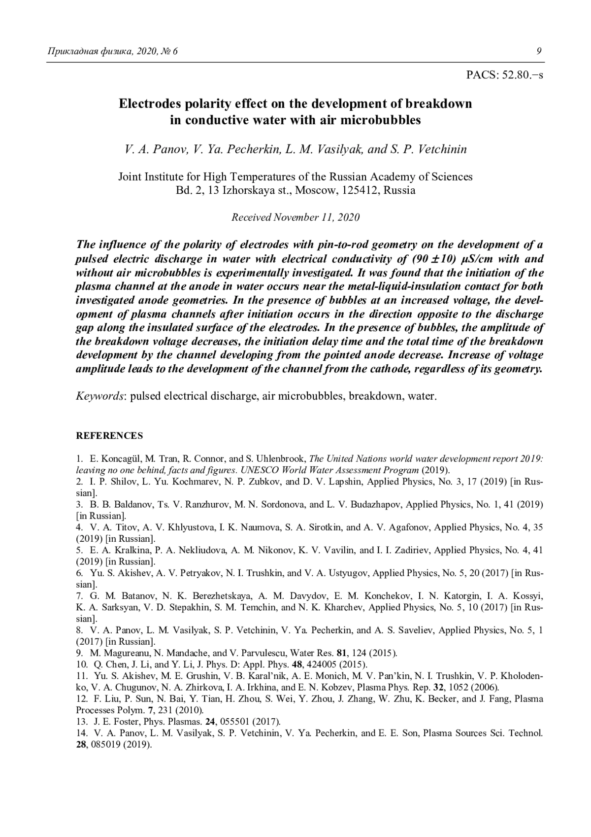 ПАНОВ В., ПЕЧЕРКИН В., ВАСИЛЯК Л., ВЕТЧИНИН С. П. ВЛИЯНИЕ ПОЛЯРНОСТИ ЭЛЕКТРОДОВ НА РАЗВИТИЕ ПРОБОЯ В ПРОВОДЯЩЕЙ ВОДЕ С МИКРОПУЗЫРЬКАМИ ВОЗДУХА // ПРИКЛАДНАЯ ФИЗИКА. 2020. №6