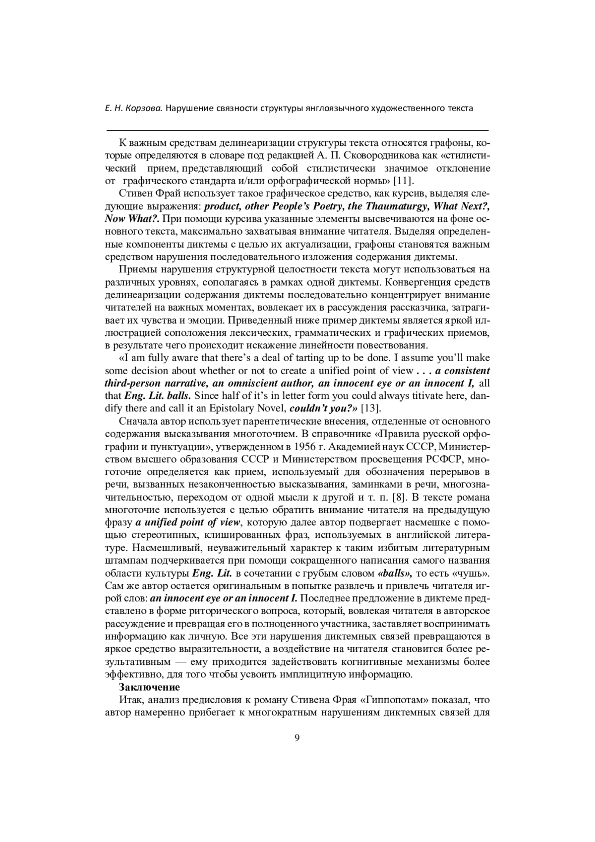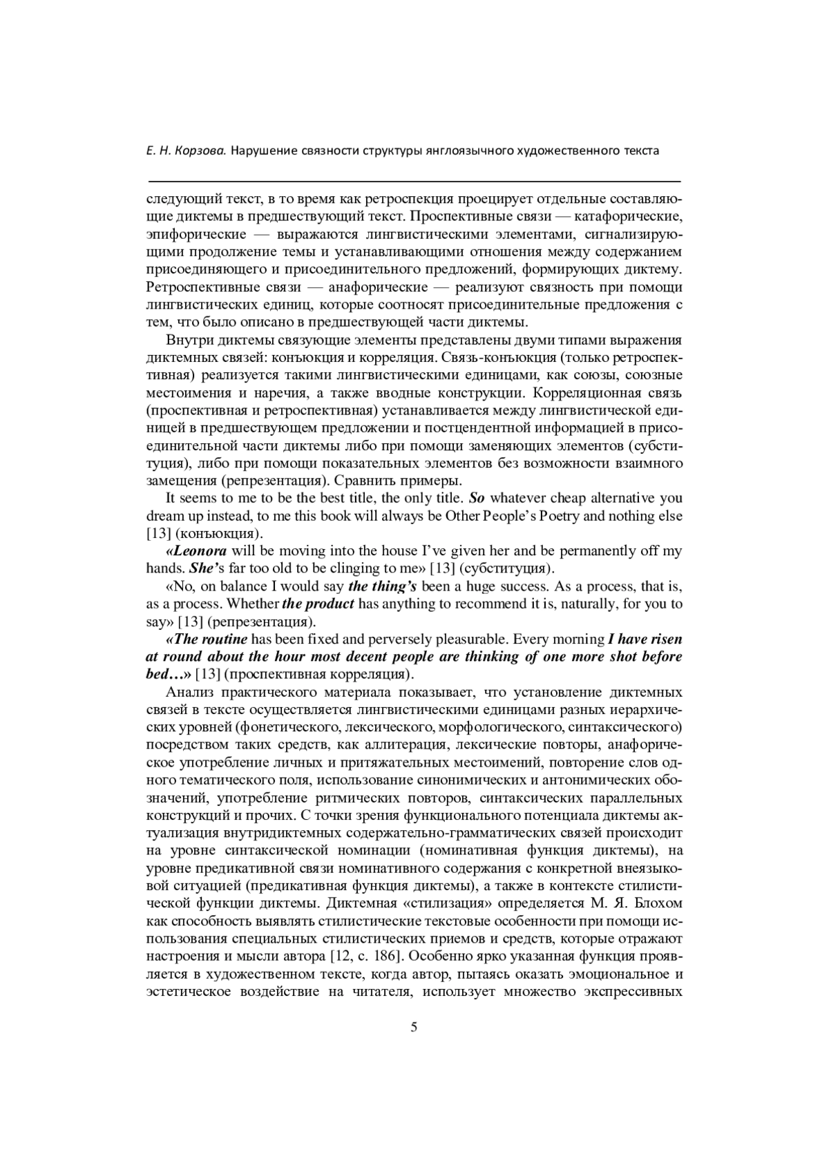 Современные лингвистические теории и подходы к исследованиям текста и его категорий открывают новые возможности интерпретации категории связности по отношению к художественному тексу. Актуальность данной темы обусловливается неизученностью средств семантико-синтаксических нарушений текстовой связности как факторов влияния на восприятие читателем художественного текста.