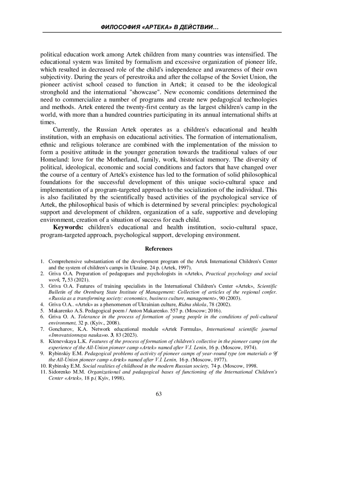 ГРИВА О. А., ЧЁРНЫЙ Е. В. ФИЛОСОФИЯ «АРТЕКА» В ДЕЙСТВИИ // УЧЕНЫЕ ЗАПИСКИ КРЫМСКОГО ФЕДЕРАЛЬНОГО УНИВЕРСИТЕТА ИМЕНИ В. И. ВЕРНАДСКОГО. СОЦИОЛОГИЯ. ПЕДАГОГИКА. ПСИХОЛОГИЯ. 2025. ТОМ 11 (77). № 1
