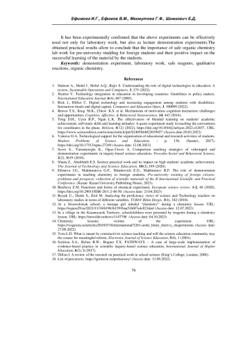 9. Ефимова И.Г. Роль демонстрационных экспериментов при обучении химии иностранных учащихся / И.Г. Ефимова, Г.Ф. Махмутова, Е.Д. Шимкович, Р.Ф. Махмутов // Довузовская подготовка иностранных граждан: проблемы и перспективы: сборник научных материалов II Международной научно-практической конференции. - Казань: Издательство Казанского университета, 2023. - С. 122-124. EDN: QARWVL