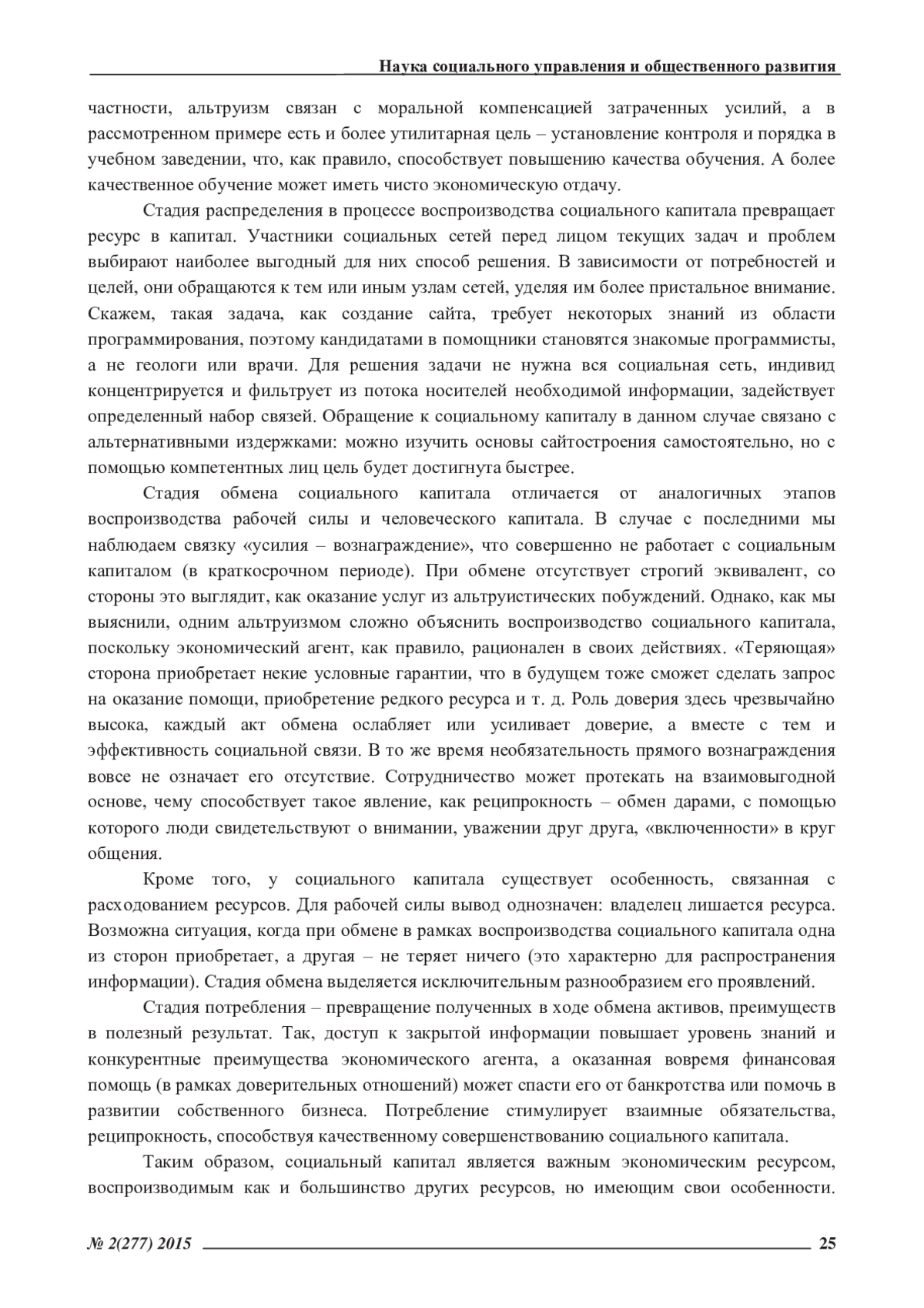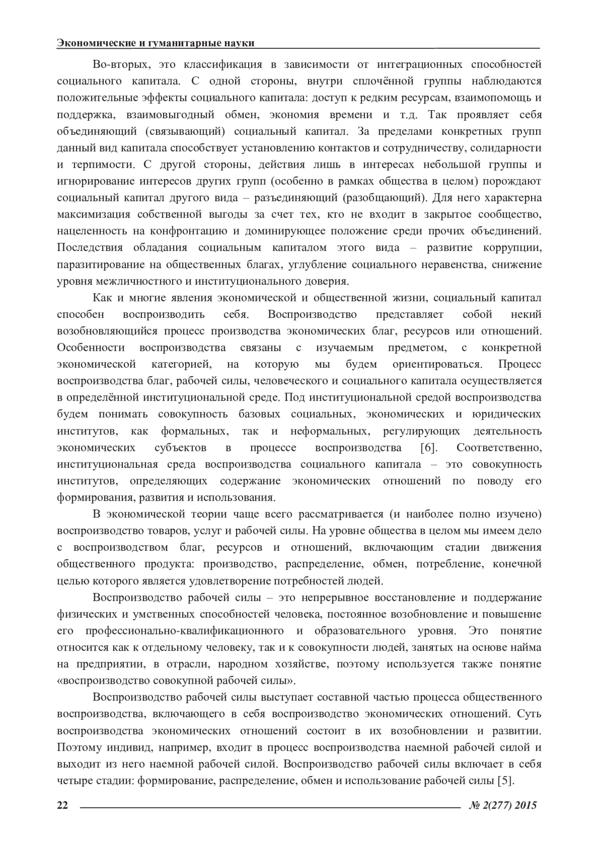 В статье приведена классификация социального капитала по двум основаниям, особое внимание уделено его разделению на объединяющий и разобщающий. Дано понятие и выявлены особенности воспроизводства социального капитала, к числу которых относится, в частности, определяющая роль доверия и несимметричность обмена. Проанализированы стадии воспроизводства социального капитала: накопление, распределение, обмен, использование. Раскрыто понятие институциональной среды воспроизводства социального капитала