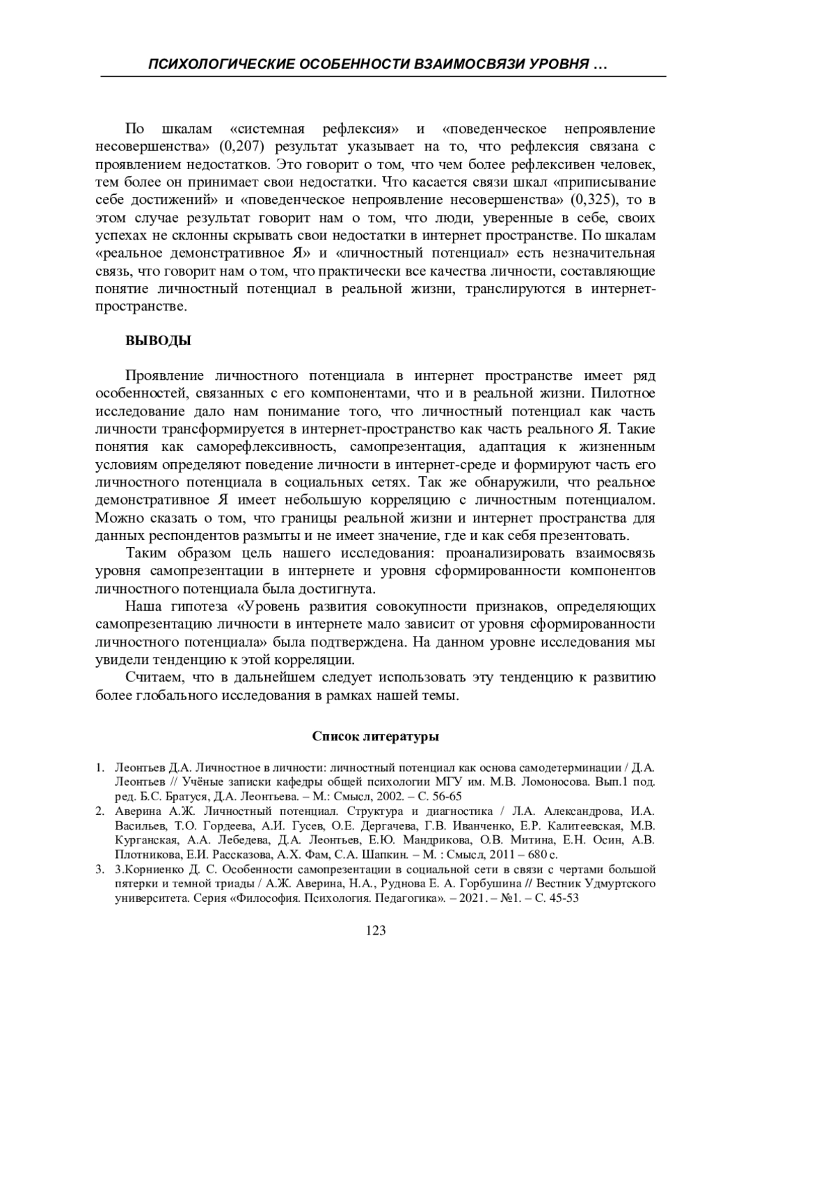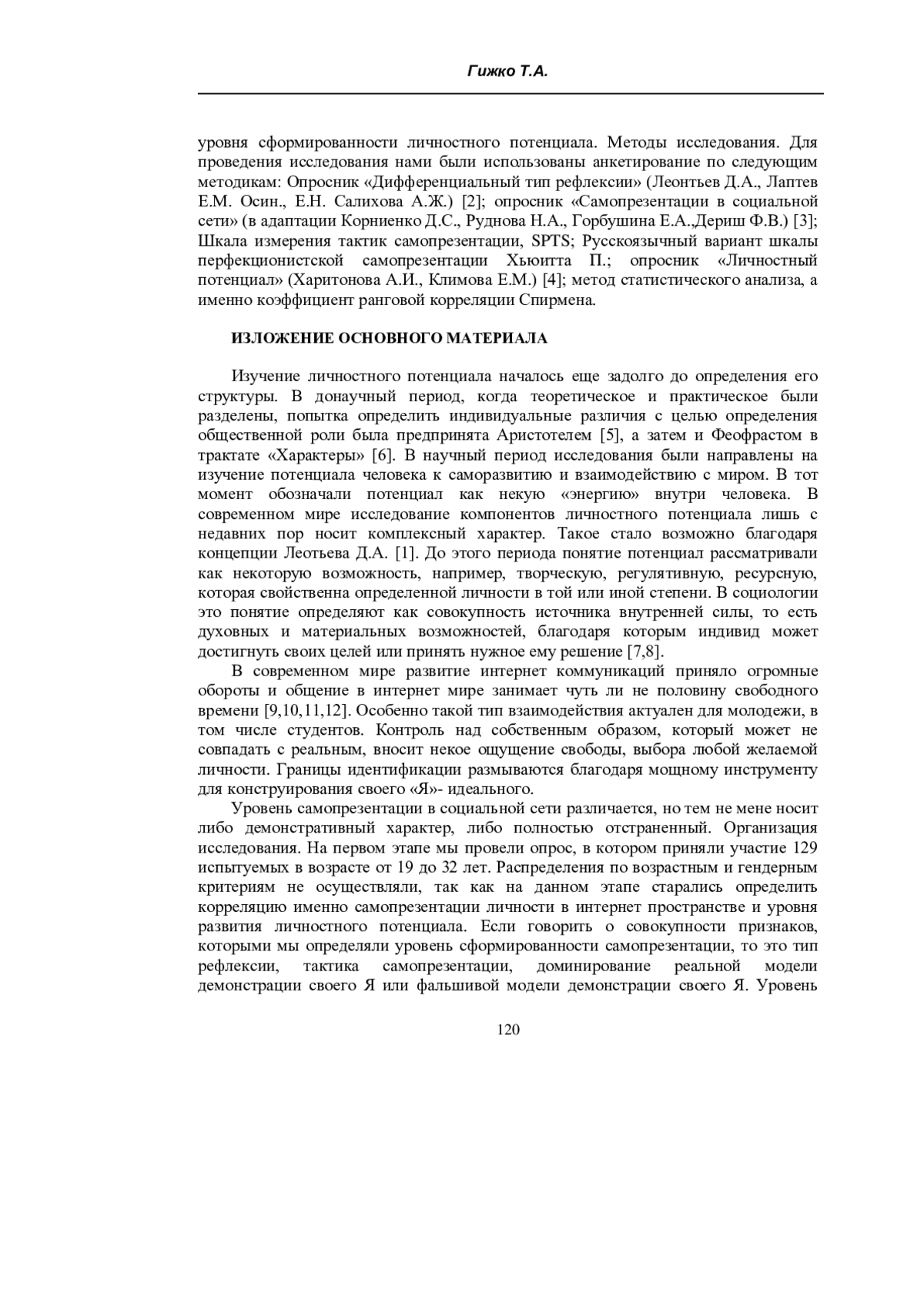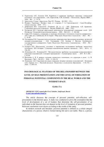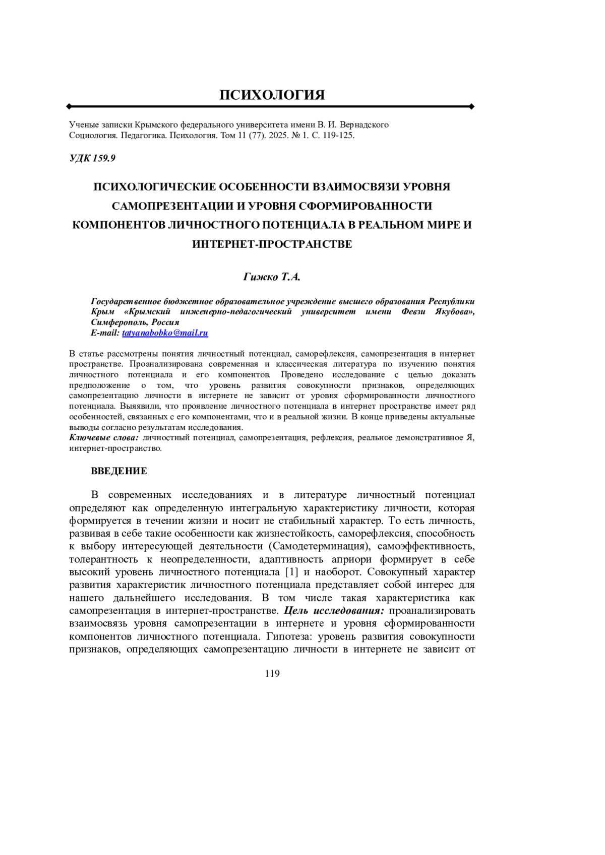 ГИЖКО Т. А. ПСИХОЛОГИЧЕСКИЕ ОСОБЕННОСТИ ВЗАИМОСВЯЗИ УРОВНЯ САМОПРЕЗЕНТАЦИИ И УРОВНЯ СФОРМИРОВАННОСТИ КОМПОНЕНТОВ ЛИЧНОСТНОГО ПОТЕНЦИАЛА В РЕАЛЬНОМ МИРЕ И ИНТЕРНЕТ-ПРОСТРАНСТВЕ // УЧЕНЫЕ ЗАПИСКИ КРЫМСКОГО ФЕДЕРАЛЬНОГО УНИВЕРСИТЕТА ИМЕНИ В. И. ВЕРНАДСКОГО. СОЦИОЛОГИЯ. ПЕДАГОГИКА. ПСИХОЛОГИЯ. 2025. ТОМ 11 (77). № 1