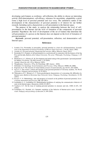 Статья: ПСИХОЛОГИЧЕСКИЕ ОСОБЕННОСТИ ВЗАИМОСВЯЗИ УРОВНЯ САМОПРЕЗЕНТАЦИИ И УРОВНЯ СФОРМИРОВАННОСТИ КОМПОНЕНТОВ ЛИЧНОСТНОГО ПОТЕНЦИАЛА В РЕАЛЬНОМ МИРЕ И ИНТЕРНЕТ-ПРОСТРАНСТВЕ (2025)