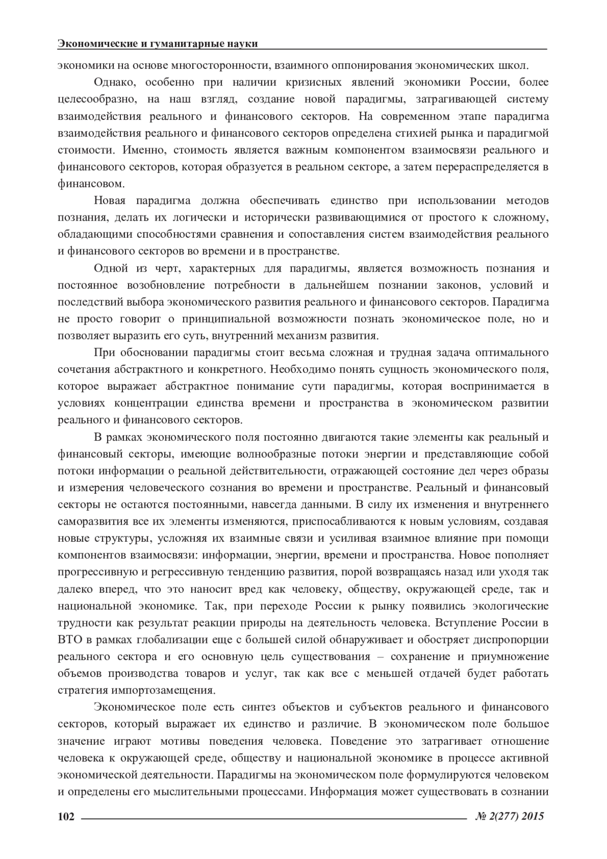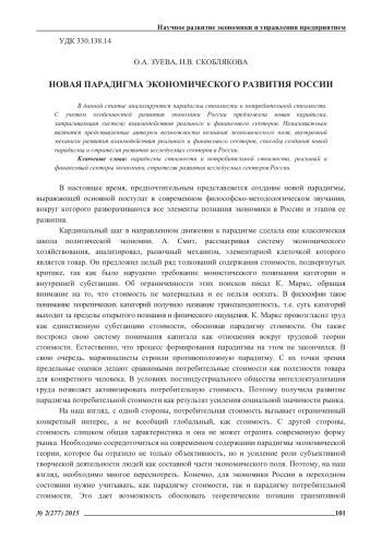 В данной статье анализируются парадигмы стоимости и потребительной стоимости. С учетом особенностей развития экономики России предложена новая парадигма, затрагивающая систему взаимодействия реального и финансового секторов. Немаловажным являются представленные автором возможности познания экономического поля, внутренний механизм развития взаимодействия реального и финансового секторов, способы создания новой парадигмы и стратегия развития исследуемых секторов в России