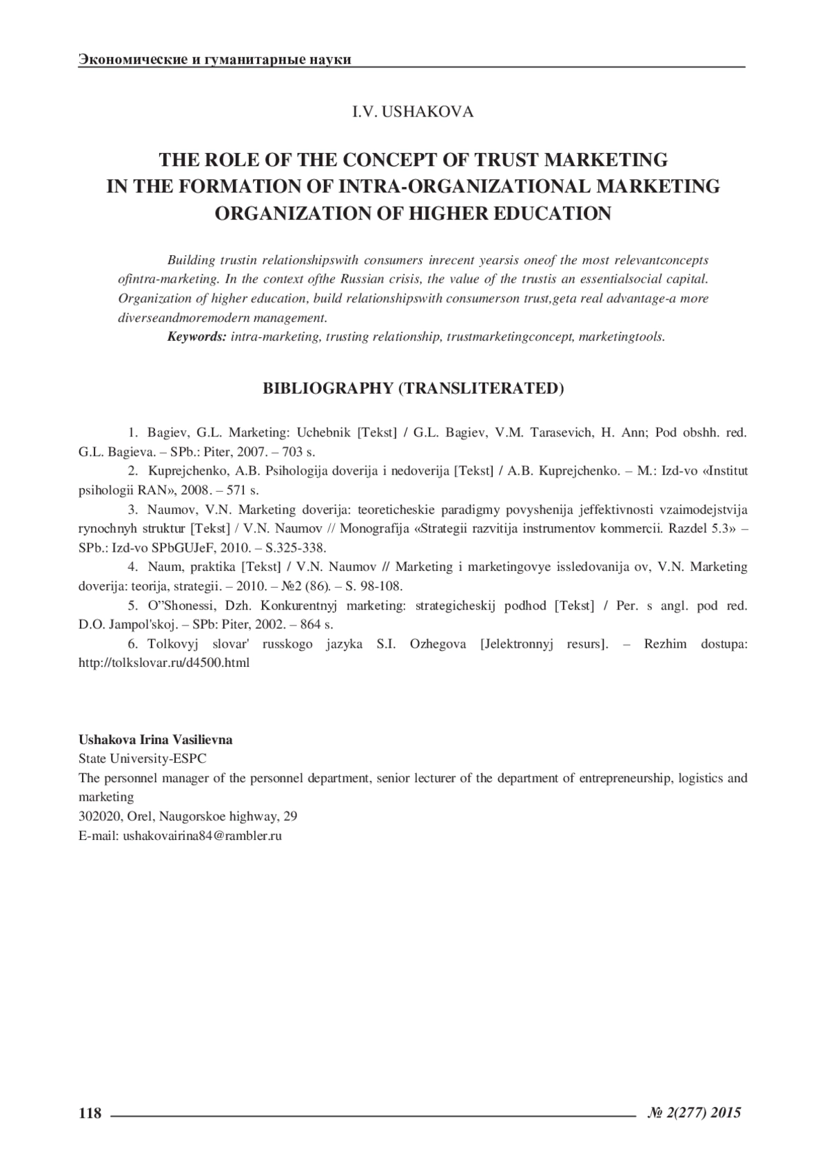 Формирование доверия во взаимоотношениях с потребителями в последнее время является одной из наиболее актуальных концепций внутриорганизационного маркетинга. В условиях российского кризиса, значение доверия выступает существенным социальным капиталом. Организации высшего образования, построившие отношения с потребителями на доверии, получают реальное преимущество – более разнообразный и более современный менеджмент