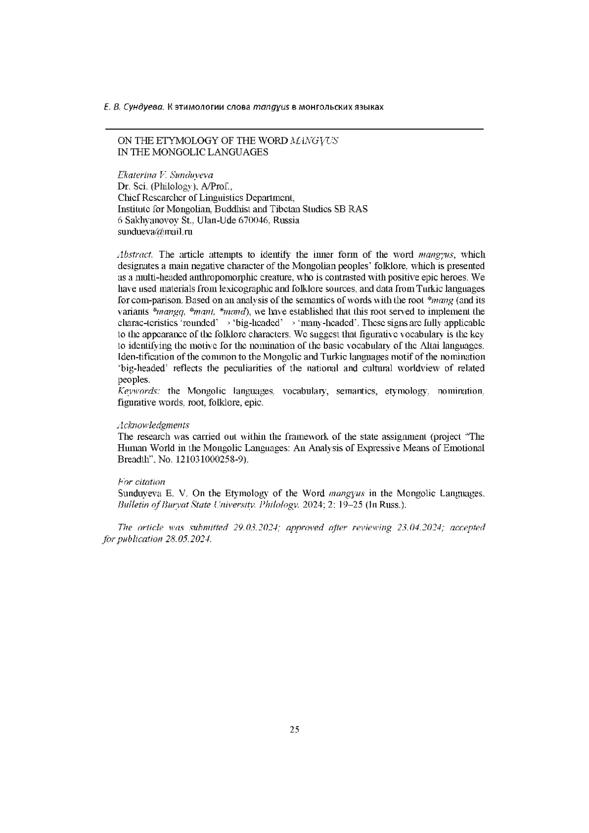 В данной работе предпринята попытка выявить внутреннюю форму слова mangyus, обозначающего основного отрицательного персонажа из фольклора монгольских народов в виде многоголового антропоморфного существа, противопоставляемого положительным эпическим героям. Использованы материалы лексикографических и фольклорных источников, также для сравнения привлекаются данные тюркских языков. На основе анализа семантики слов с корнем *mang (и его вариантов *mangq, *mant, *mand) автор устанавливает, что данный корень служил для реализации признаков ‘округлый’ → ‘большеголовый’ → ‘многоголовый’. Эти признаки в полной мере применимы к внешнему виду рассматриваемых фольклорных персонажей. Автор предполагает, что именно образная лексика является ключом к выявлению мотива номинации базовой лексики алтайских языков. Выявление общего для монгольских и тюркских языков мотива номинации ‘большеголовый’ отражает особенности национально -культурного мировидения родственных народов.