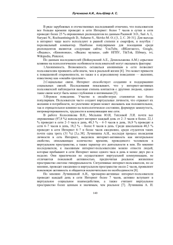 3. Колесников В.Н., Мельник Ю.И., Теплова Л.И. Интернет-активность и проблемное использование интернета в юношеском возрасте / В.Н. Колесников, Ю.И. Мельник, Л.И. Теплова // Национальный психологический журнал. - 2019. - №1 (33). - URL: https://cyberleninka.ru/article/n/internet-aktivnost-i-problemnoe-ispolzovanie-interneta-v-yunosheskom-vozraste (дата обращения: 09.03.2025). EDN: ZTIWUH