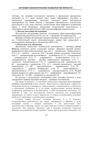В данной статье представлены результаты эмпирического исследования психологических особенностей личности интернет-активных пользователей. Указано, что психология интернет-активных пользователей являет собой важную область исследований, которая позволяет понять, как онлайн-взаимодействия влияют на личность и поведение. Приведен итог диагностики психологических характеристик чрезмерно активных пользователей интернета: предположение о замкнутости, интровертированности, наличии трудностей в коммуникации не подтверждено. Напротив, выяснилось, что отличительными чертами интернет-активных пользователей являются: общительность, независимость, контактность, добродушие, открытость, социальная смелость, импульсивность, социабельность, стремление к социальному одобрению, конформизм, неадекватная самооценка.