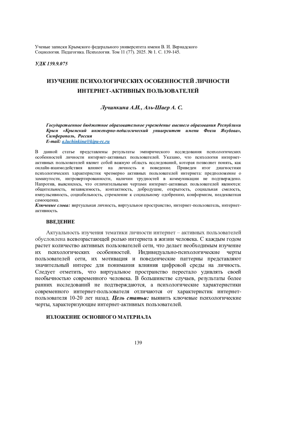 6. Лучинкина А.И. Особенности коммуникативного поведения личности подростков с разными уровнями суицидальных рисков при смене реальности / Лучинкина А.И., Руденко Е.С. // Российский психологический журнал. - 2022. - Т. 19, № 2. - С. 118-128. EDN: YFPHEF