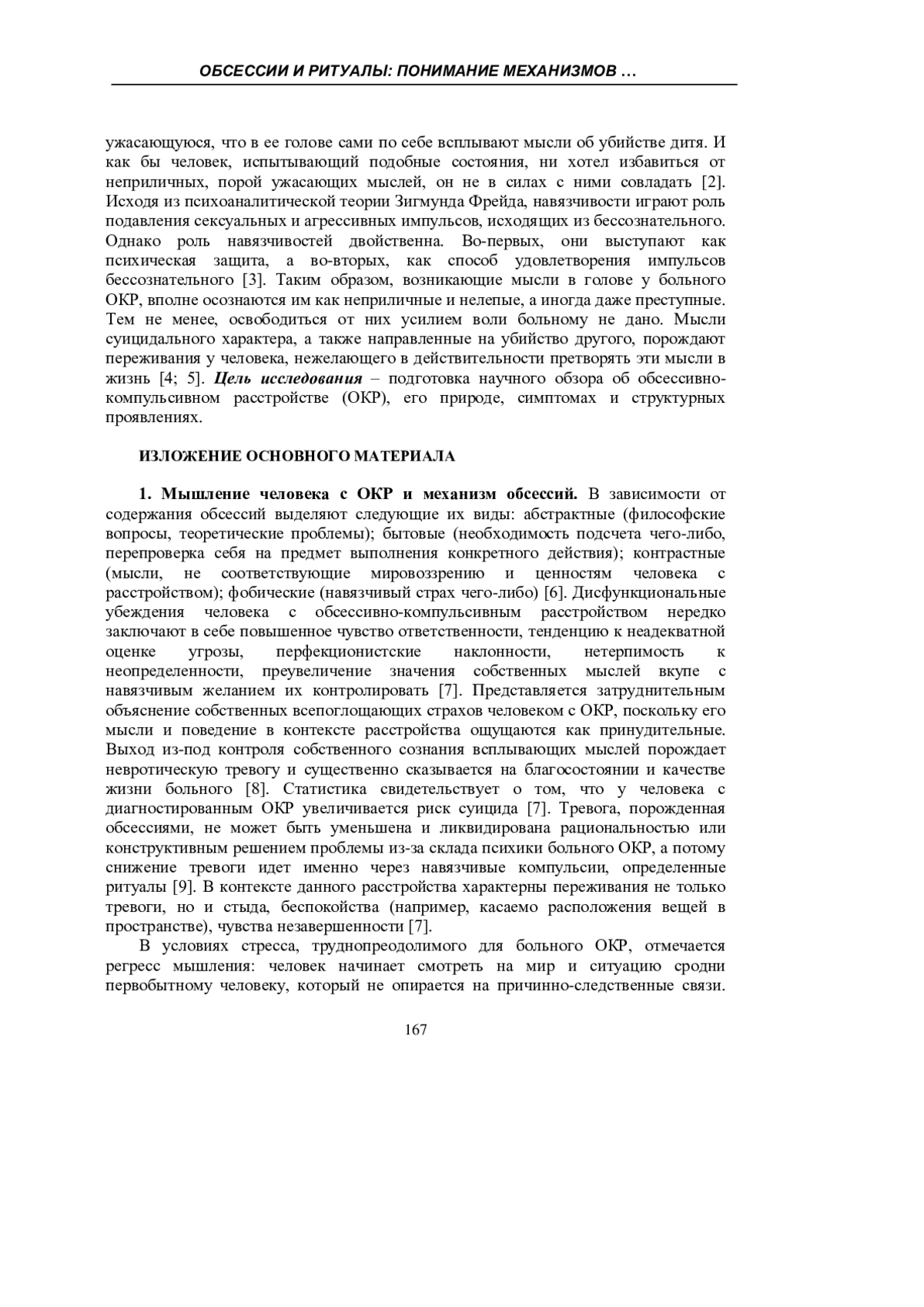 В статье рассматривается обсессивно-компульсивное расстройство (ОКР) как сложное психическое заболевание, характеризующееся наличием навязчивых мыслей (обсессий) и повторяющихся действий (компульсий). Обсессивно-компульсивное расстройство негативно влияет на качество жизни больного, приводя к значительному дискомфорту и нарушению повседневной активности. В статье описаны механизмы возникновения и протекания навязчивых мыслей и компульсий, приведены их классификации. Авторами статьи указана и роль магического мышления как составляющей расстройства. Рассмотрены и проанализированы источники формирования данного заболевания у человека. Статья направлена на расширение понимания ОКР среди специалистов в области психического здоровья и повышения информированности широкой аудитории, что может способствовать более ранней диагностике и эффективному лечению.