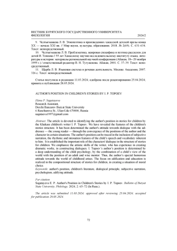 Статья посвящена выявлению авторской позиции в рассказах для детей хакасского детского писателя И. П. Топоева. Выявляются особенности структуры детских рассказов. Определяется авторская установка на диалог с адресатом - юным читателем - через сближение в определенных ситуациях позиций автора и героя. Авторская позиция прослеживается в использовании субъективированного повествования, во включении в повествовательную ткань произведения ритмико-интонационного строя речи героя-ребенка, присущей ему лексики. Устанавливается важная роль диалога героев в структуре рассказов для детей. Выявляется художественное мастерство писателя, имеющего опыт создания драматических произведений, в построении диалогов. Авторская позиция И. Топоева формируется на основе глубокого понимания закономерностей детской психологии, она прослеживается в сочетании детского взгляда на мир с позицией взрослого и мудрого наставника. Здесь возникает особое юмористическое отношение автора к миру детства. Установка на назидание и воспитание реализуется в композиционной структуре рассказов для детей, в создании ситуации нравственного выбора.