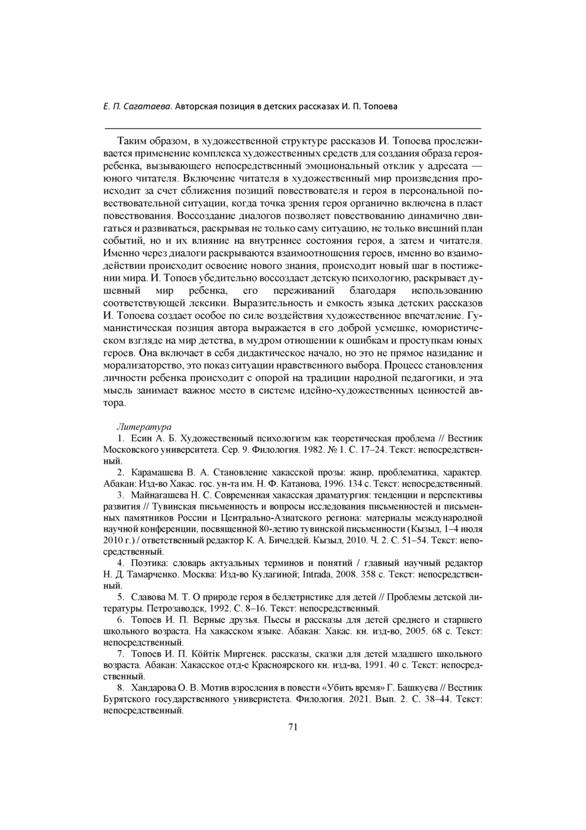 10. Челтыгмашева Л. В. Проблематика, жанровая специфика и поэтика рассказов для детей И. Топоева // 55 лет Хакасскому научно-исследовательскому институту языка, литературы и истории: материалы региональной научной конференции (Абакан, 18-20 ноября 1999 г.) / ответственный редактор B. Н. Тугужекова. Абакан, 2001. С. 37-39. Текст: непосредственный.