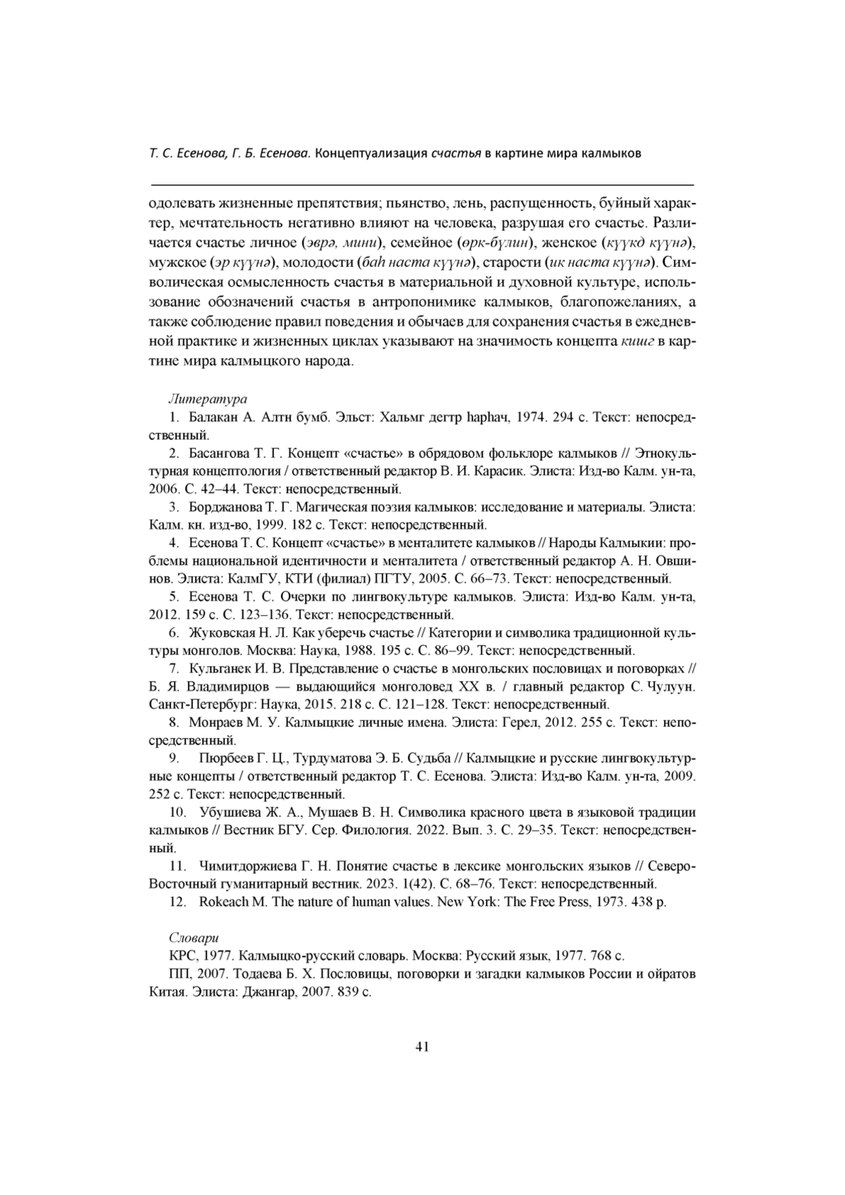 2. Басангова Т. Г. Концепт “счастье” в обрядовом фольклоре калмыков // Этнокультурная концептология / ответственный редактор В. И. Карасик. Элиста: Изд-во Калм. ун-та, 2006. С. 42-44. Текст: непосредственный.