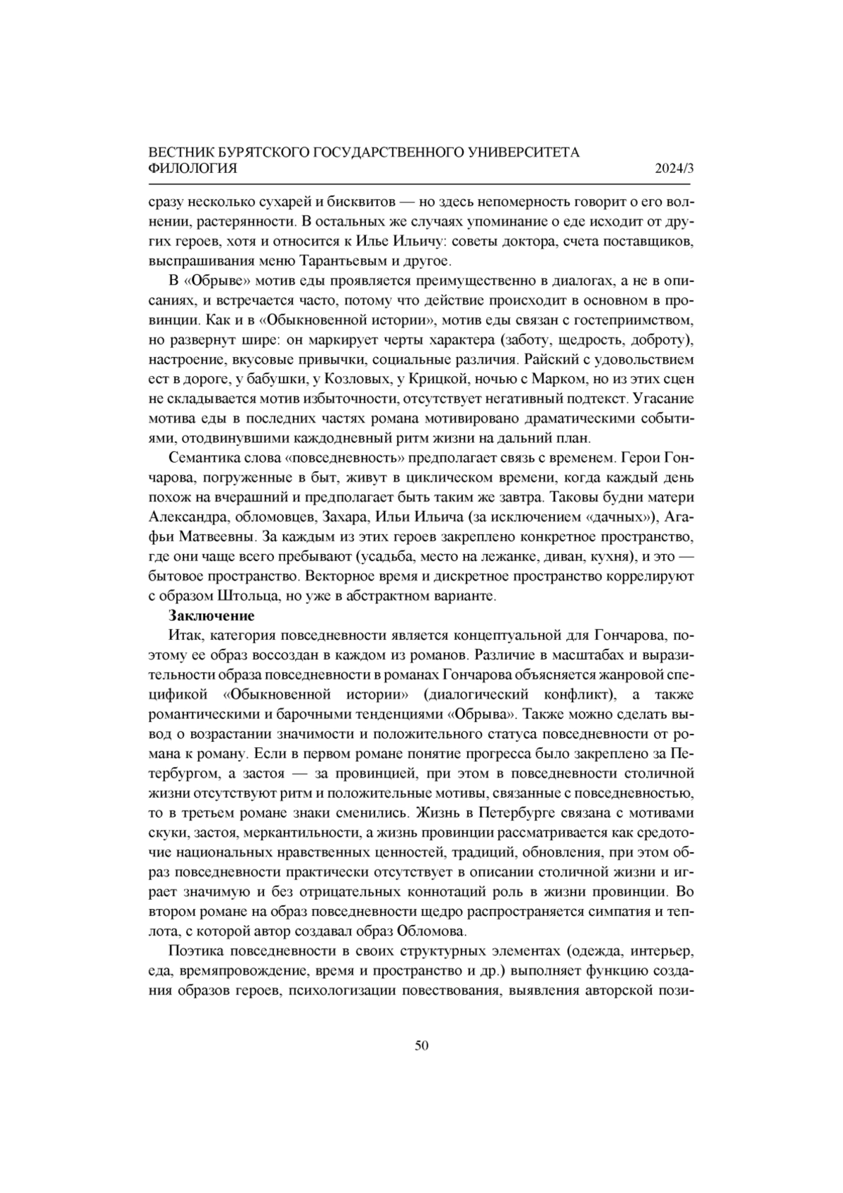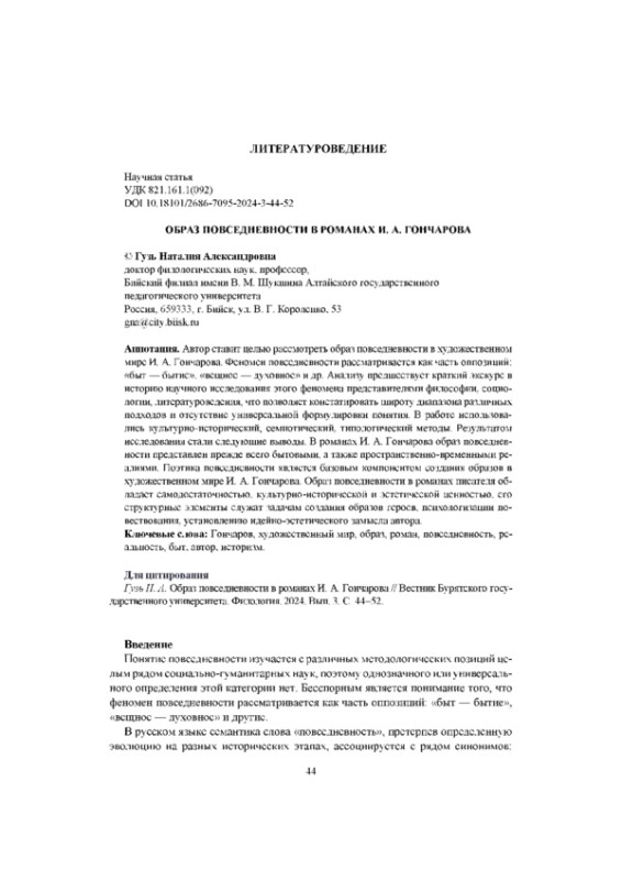Автор ставит целью рассмотреть образ повседневности в художественном мире И. А. Гончарова. Феномен повседневности рассматривается как часть оппозиций: «быт - бытие», «вещное - духовное» и др. Анализу предшествует краткий экскурс в историю научного исследования этого феномена представителями философии, социологии, литературоведения, что позволяет констатировать широту диапазона различных подходов и отсутствие универсальной формулировки понятия. В работе использовались культурно-исторический, семиотический, типологический методы. Результатом исследования стали следующие выводы. В романах И. А. Гончарова образ повседневности представлен прежде всего бытовыми, а также пространственно-временными реалиями. Поэтика повседневности является базовым компонентом создания образов в художественном мире И. А. Гончарова. Образ повседневности в романах писателя обладает самодостаточностью, культурно-исторической и эстетической ценностью, его структурные элементы служат задачам создания образов героев, психологизации повествования, установлению идейно-эстетического замысла автора.