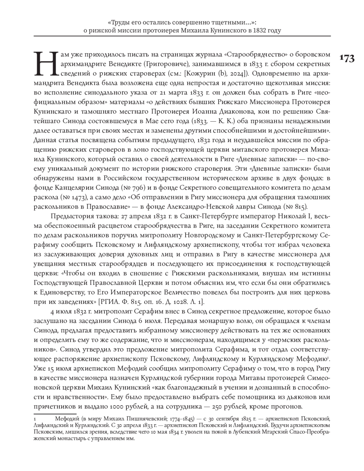 Нам уже приходилось писать на страницах журнала «Старообрядчество» о боровском архимандрите Венедикте (Григоровиче), занимавшимся в 1833 г. сбором секретных сведений о рижских староверах (см.: [Кожурин (b), 2024]). Одновременно на архимандрита Венедикта была возложена еще одна непростая и достаточно щекотливая миссия: во исполнение синодального указа от 21 марта 1833 г. он должен был собрать в Риге «неофициальным образом» материалы «о действиях бывших Рижскаго Миссионера Протоиерея Кунинскаго и тамошняго местнаго Протоиерея Иоанна Диаконова, кои по решению Святейшаго Синода состоявшемуся в Мае сего года (1833. — К. К.) оба признаны ненадежными далее оставаться при своих местах и заменены другими способнейшими и достойнейшими». Данная статья посвящена событиям предыдущего, 1832 года и неудавшейся миссии по обращению рижских староверов в лоно господствующей церкви митавского протоиерея Михаила Кунинского, который оставил о своей деятельности в Риге «Дневные записки» — по-своему уникальный документ по истории рижского староверия. Эти «Дневные записки» были обнаружены нами в Российском государственном историческом архиве в двух фондах: в фонде Канцелярии Синода (№ 796) и в фонде Секретного совещательного комитета по делам раскола (№ 1473), а само дело «Об отправлении в Ригу миссионера для обращения тамошних раскольников в Православие» — в фонде Александро-Невской лавры Синода (№ 815).