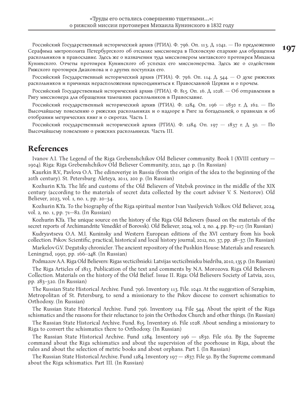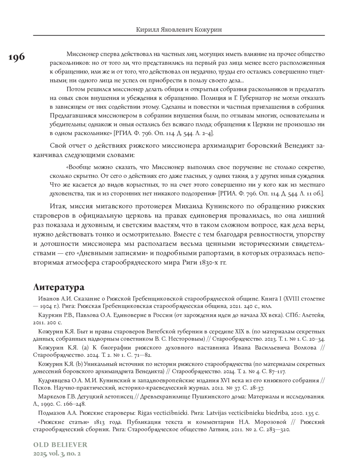 5. Кожурин К.Я. Уникальный источник по истории рижского старообрядчества (по материалам секретных донесений боровского архимандрита Венедикта) // Старообрядчество. 2024. Т. 2. № 4. С. 87-117.