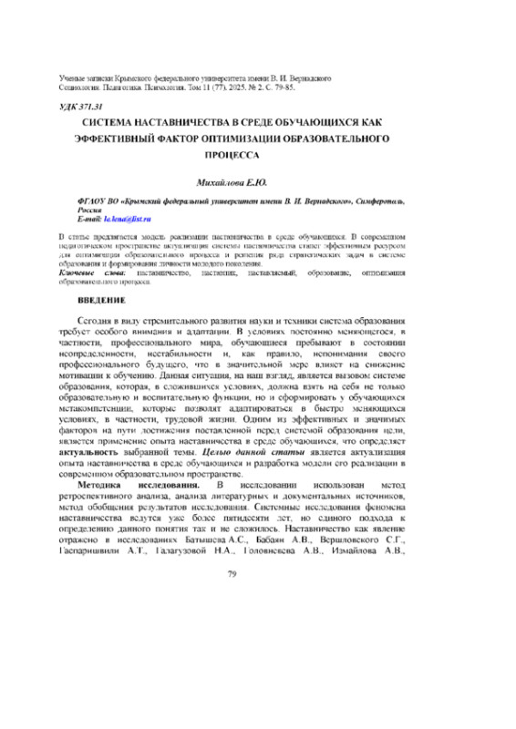 В статье предлагается модель реализации наставничества в среде обучающихся. В современном педагогическом пространстве актуализация системы наставничества станет эффективным ресурсом для оптимизации образовательного процесса и решения ряда стратегических задач в системе образования и формирования личности молодого поколения.