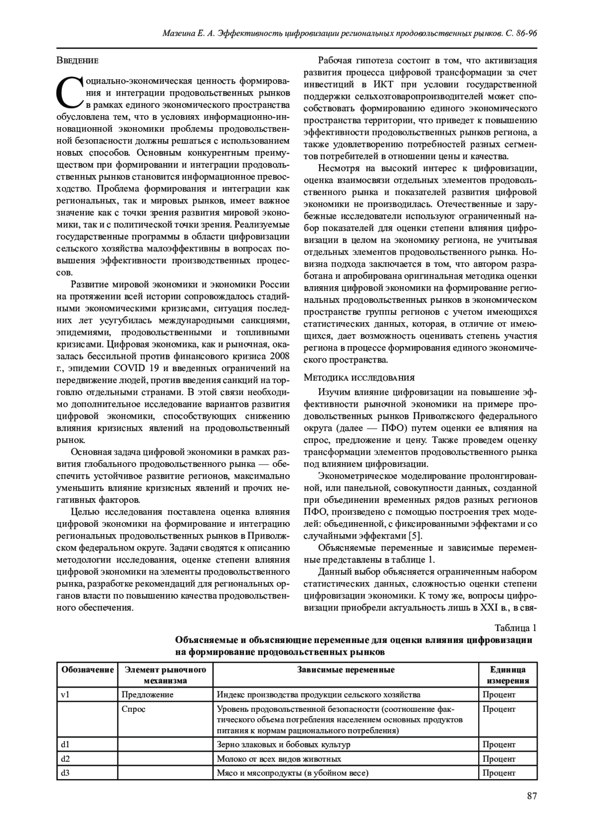 Развитию цифровой экономики наравне с вопросами обеспечения продовольствием населения уделяется внимание во всем мире. Однако ввиду недостаточности исследований в области влияния цифровизации на формирование рынков продовольствия не раскрыты механизмы государственной политики в вопросах обеспечения продовольственной безопасности. Статья посвящена разработке рекомендаций для региональных властей в рамках внедрения цифровых инструментов в сферу регулирования рынков продовольствия. Методологической базой исследования послужили теории формирования рынков. В ходе исследования использованы эконометрические методы анализа панельных данных. Информационную базу исследования составили статистические данные, характеризующие степень цифровизации экономики, индексы цен на продовольствие, темпы развития производства за период 1991–2022 гг. В ходе исследования выдвинута гипотеза о том, что активизация развития процесса цифровой трансформации приведет к повышению эффективности продовольственных рынков региона, а также удовлетворению потребностей разных сегментов потребителей в отношении цены и качества. Было выявлено, что цифровые процессы в экономике (в том числе инвестиции в сферу информационных технологий) не влияли на индекс производства и продовольственную безопасность, при этом значимы в процессе формирования цен на продовольствие. Предложенный подход изучения степени влияния факторов цифровизации на формирование цен на продовольственные товары позволит разработать мероприятия по улучшению положения потребителей и повышению эффективности производства. В статье выявлены ключевые факторы цифровизации, воздействие на которые позволит усилить процессы интеграции регионов и решить проблемы продовольственного обеспечения.
