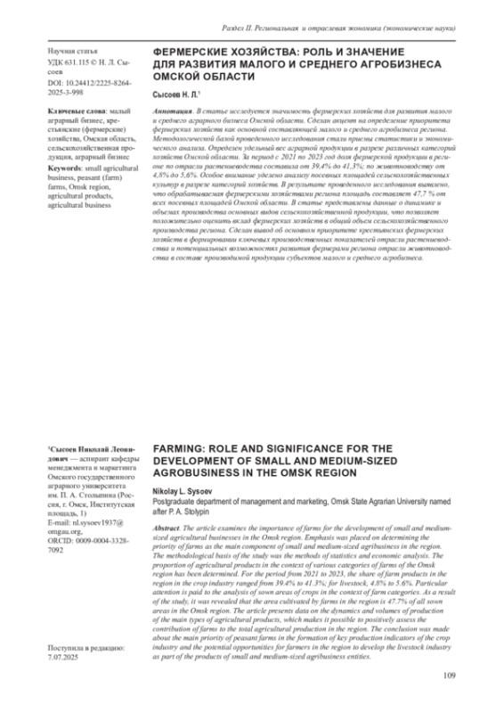 В статье исследуется значимость фермерских хозяйств для развития малого и среднего аграрного бизнеса Омской области. Сделан акцент на определение приоритета фермерских хозяйств как основной составляющей малого и среднего агробизнеса региона. Методологической базой проведенного исследования стали приемы статистики и экономического анализа. Определен удельный вес аграрной продукции в разрезе различных категорий хозяйств Омской области. За период с 2021 по 2023 год доля фермерской продукции в регионе по отрасли растениеводства составила от 39,4% до 41,3%; по животноводству от 4,8% до 5,6%. Особое внимание уделено анализу посевных площадей сельскохозяйственных культур в разрезе категорий хозяйств. В результате проведенного исследования выявлено, что обрабатываемая фермерскими хозяйствами региона площадь составляет 47,7 % от всех посевных площадей Омской области. В статье представлены данные о динамике и объемах производства основных видов сельскохозяйственной продукции, что позволяет положительно оценить вклад фермерских хозяйств в общий объем сельскохозяйственного производства региона. Сделан вывод об основном приоритете крестьянских фермерских хозяйств в формировании ключевых производственных показателей отрасли растениеводства и потенциальных возможностях развития фермерами региона отрасли животноводства в составе производимой продукции субъектов малого и среднего агробизнеса.