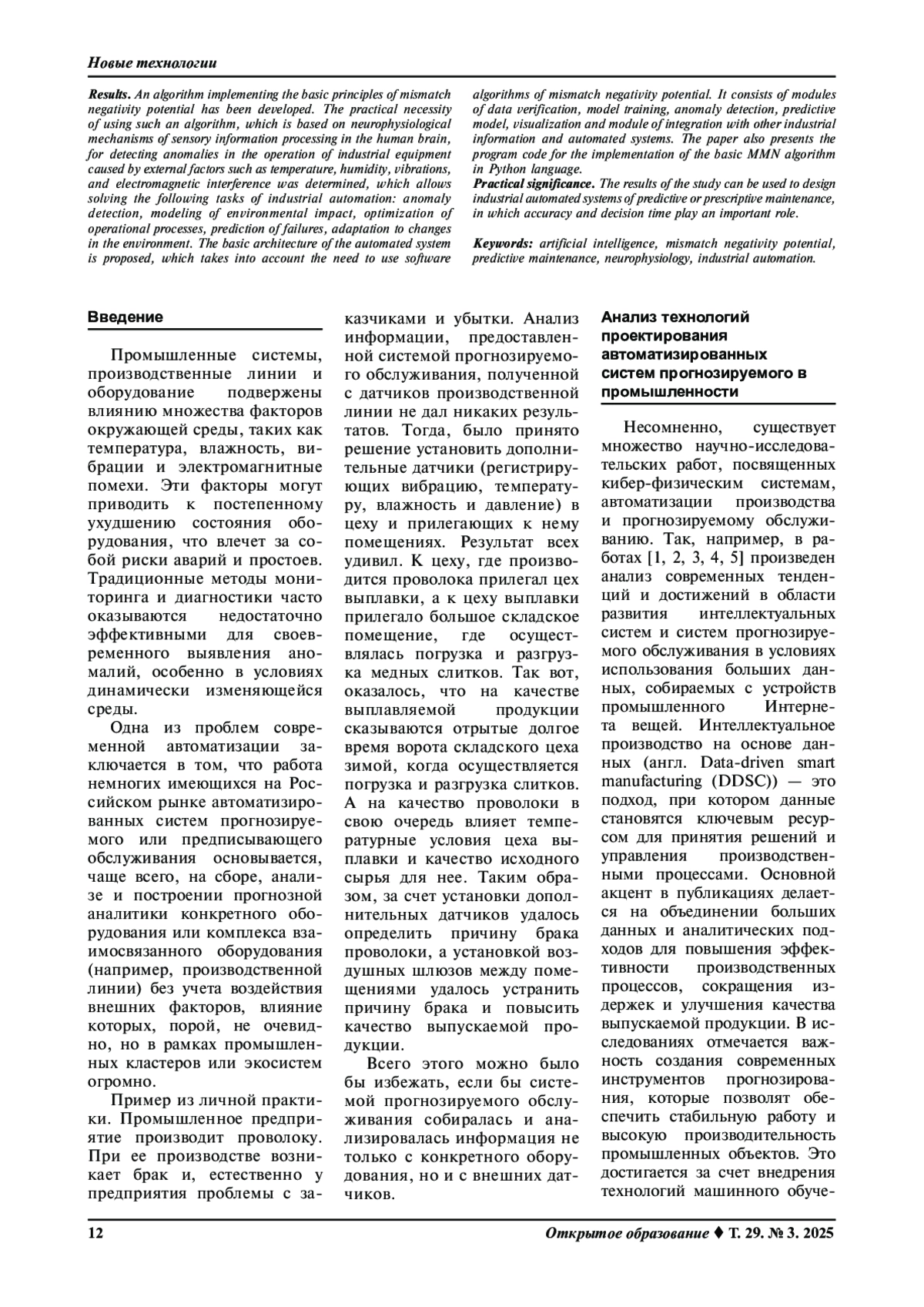 Цель. Исследовать возможность применения технологий искусственного интеллекта для реализации алгоритмов, созданных на основе потенциала негативности рассогласования (англ. mismatch negativity, MMN) и возможности их применения в промышленных автоматизированных системах прогнозируемого или предписывающего обслуживания, а также разработать базовый MMN-алгоритм и реализовать его на языке программирования Python.