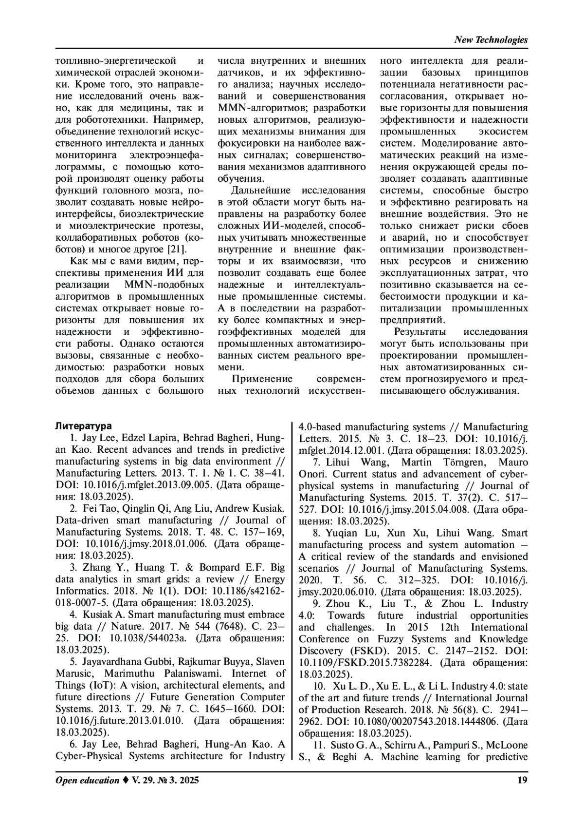 1. Jay Lee, Edzel Lapira, Behrad Bagheri, Hungan Kao. Recent advances and trends in predictive manufacturing systems in big data environment // Manufacturing Letters. 2013. Т. 1. № 1. С. 38-41. https://doi.org/10.1016/j.mfglet.2013.09.005. (Дата обращения: 18.03.2025).