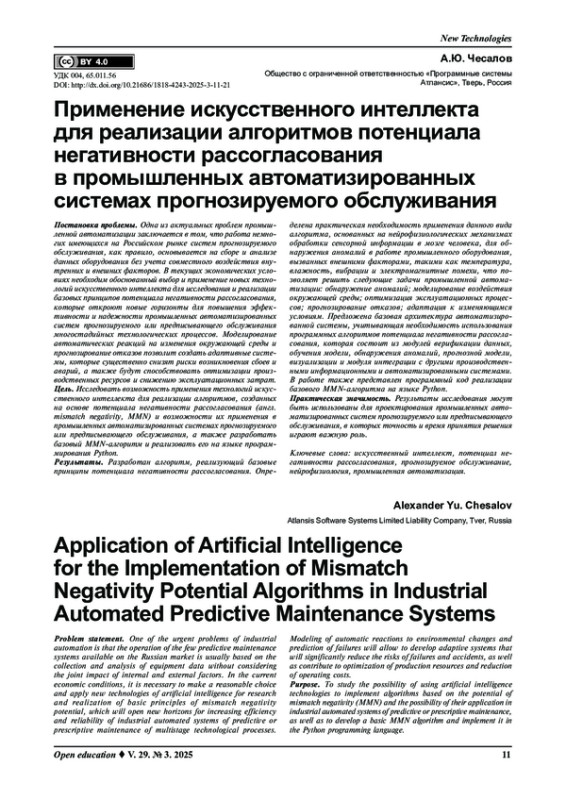 Постановка проблемы. Одна из актуальных проблем промышленной автоматизации заключается в том, что работа немногих имеющихся на Российском рынке систем прогнозируемого обслуживания, как правило, основывается на сборе и анализе данных оборудования без учета совместного воздействия внутренних и внешних факторов. В текущих экономических условиях необходим обоснованный выбор и применение новых технологий искусственного интеллекта для исследования и реализации базовых принципов потенциала негативности рассогласования, которые откроют новые горизонты для повышения эффективности и надежности промышленных автоматизированных систем прогнозируемого или предписывающего обслуживания многостадийных технологических процессов. Моделирование автоматических реакций на изменения окружающей среды и прогнозирование отказов позволит создать адаптивные системы, которые существенно снизят риски возникновения сбоев и аварий, а также будут способствовать оптимизации производственных ресурсов и снижению эксплуатационных затрат.