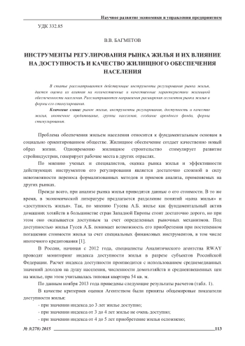 По мнению ученых и специалистов, оценка рынка жилья и эффективности действующих инструментов его регулирования является достаточно сложной в силу невозможности переноса формализованных методов и приемов анализа, применяемых на других рынках