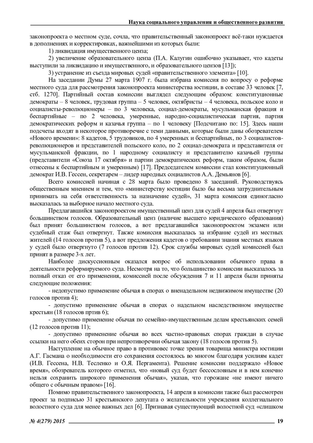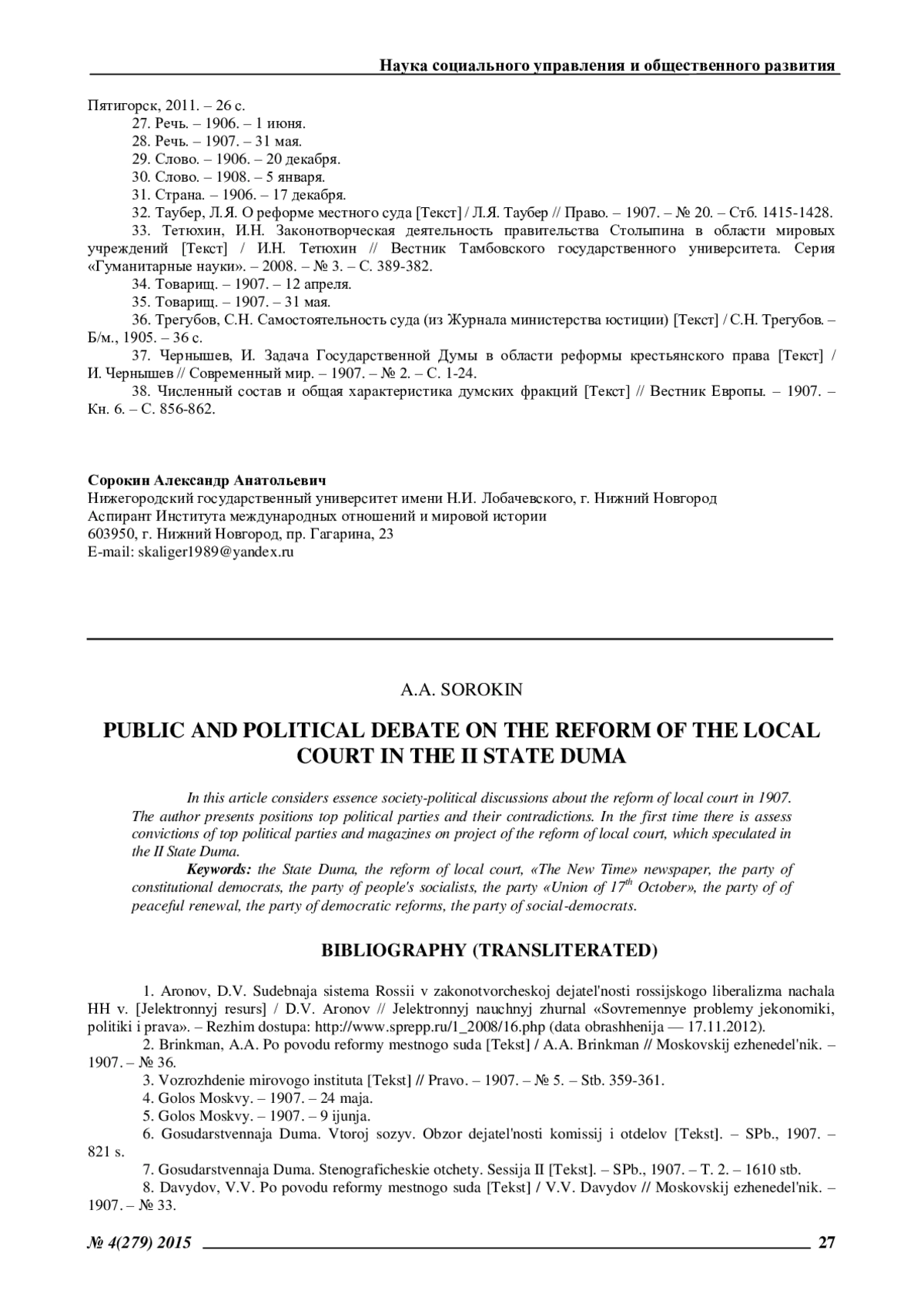 26. Радуто, Р.В. Исторические этапы развития судебной системы в России в конце XIX - начале XX века: общероссийские тенденции и региональные особенности [Текст] / Р.В. Радуто // Автореф. дисс. … к.и.н. - № 4(279) 2015 Н аука социаль ного управ ления и общес тв енного развития Пятигорск, 2011. - 26 с. EDN: QFHSZD