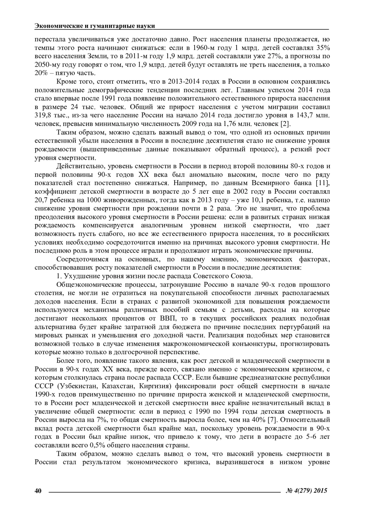 Говоря о различных экономических проблемах и их влиянии на социальнодемографические показатели, которые характеризуют уровень развития общества, нельзя обойти стороной вопрос влияния экономической среды на «демографический портрет» современного российского общества. В последнее время в научном сообществе очень часто можно слышать различные точки зрения – от лояльных до крайне радикальных – в отношении текущей демографической обстановки в России