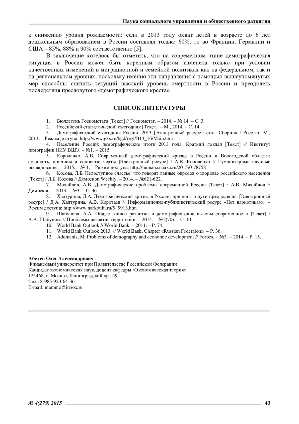 12. Adomanis, M. Problems of demography and economic development // Forbes. - №3. - 2014. - P. 15.