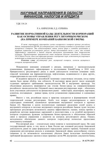 КИРИЛЛОВ Р. А., СЕРБИНА Е. Д. РАЗВИТИЕ НОРМАТИВНОЙ БАЗЫ ДЕЯТЕЛЬНОСТИ КОРПОРАЦИЙ КАК ОСНОВЫ УПРАВЛЕНИЯ РЕГУЛЯТОРНЫМ РИСКОМ(НА ПРИМЕРЕ КОМПАНИЙ БАНКОВСКОЙ СФЕРЫ) // ЭКОНОМИЧЕСКИЕ И ГУМАНИТАРНЫЕ НАУКИ. 2015. № 4 (279)