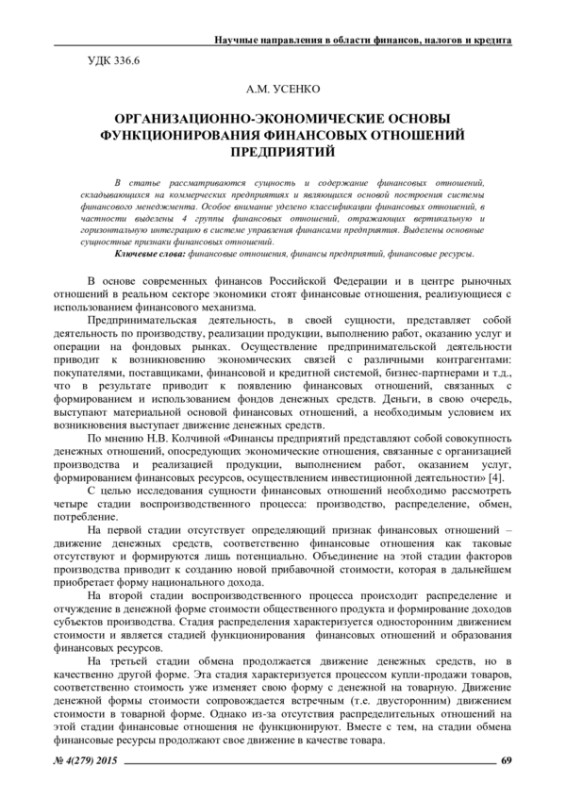 В статье рассматриваются сущность и содержание финансовых отношений, складывающихся на коммерческих предприятиях и являющихся основой построения системы финансового менеджмента. Особое внимание уделено классификации финансовых отношений, в частности выделены 4 группы финансовых отношений, отражающих вертикальную и горизонтальную интеграцию в системе управления финансами предприятия. Выделены основные сущностные признаки финансовых отношений