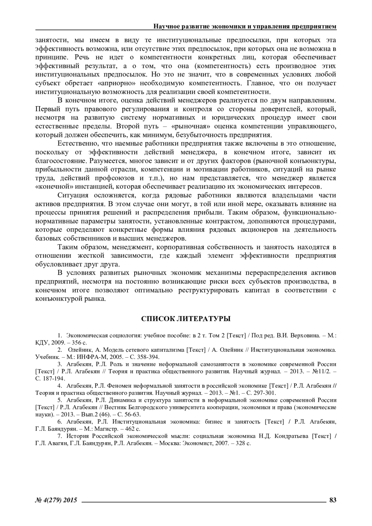 6. Агабекян, Р.Л. Институциональная экономика: бизнес и занятость /Р.Л. Агабекян, Г.Л. Баяндурян. -М.: Магистр. -462 с. EDN: RNBTRH