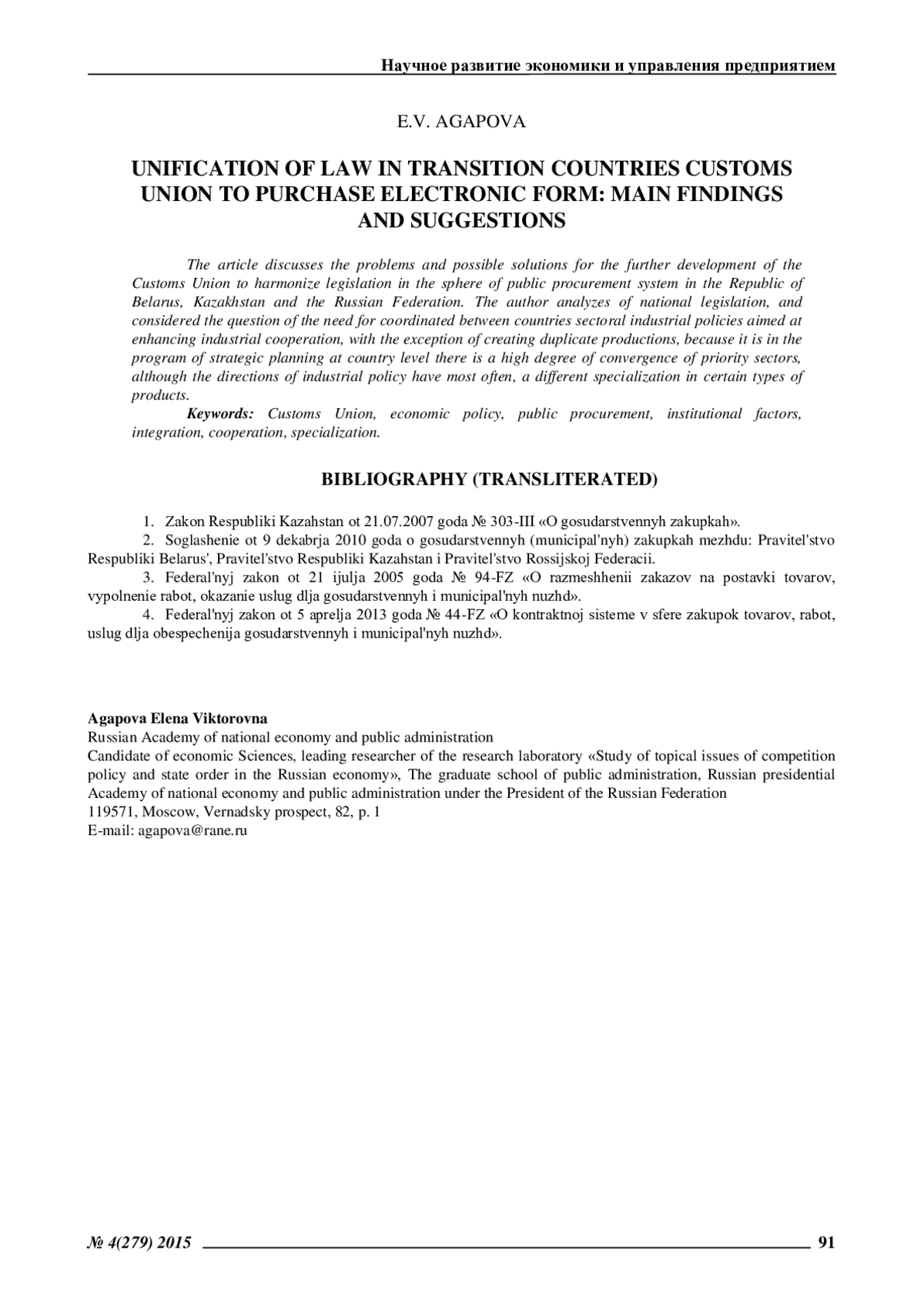 В работе проведен анализ национальных законодательств Республики Казахстан, Республики Беларусь и Российской Федерации в сфере электронных закупок после заключения между ними Соглашения о государственных (муниципальных) закупках от 09.12.2010 года [2]: – в Российской Федерации (Закон 94-ФЗ [3] и Закон 44-ФЗ [4]); в Республике Беларусь (Закон Республики Беларусь от 13 июля 2012 г. No 419-З); в Республике Казахстан (Закон РК от 21.07.2007 года No 303-III «О государственных закупках» (с изменениями и дополнениями по состоянию на 15.01.2014 г.)
